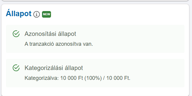 - Kategorizált: A tranzakció teljes összege kategorizálásra került. A tranzakció adatlapján látszik a kategorizált összeg, és hogy ez a tranzakció 100%-a.