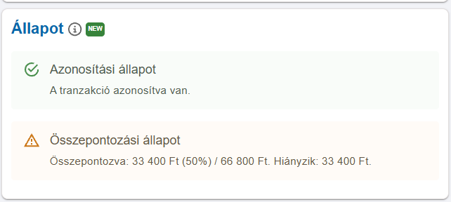 - Részlegesen összepontozott: A tranzakció egy része összepontozásra került egy vagy több ügylettel, de még van a tranzakció söszegéből fennmaradó rész, amihez nem került kapcsolásra ügylet.