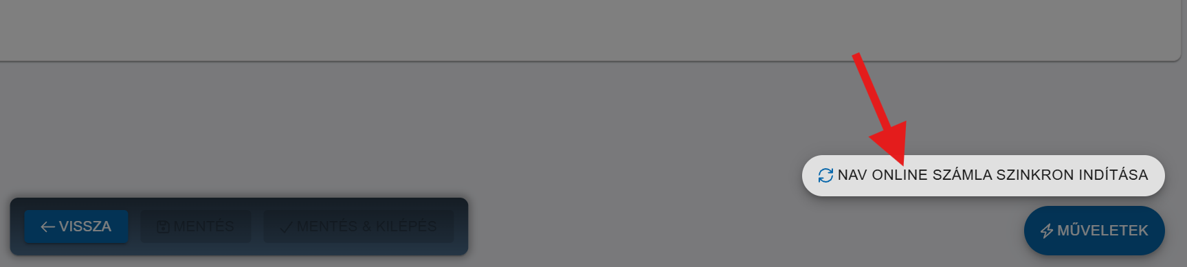 Ezután indítsuk el a jobb alsó sarokban található Műveletek -> NAV Online Számla szinkron indítása művelettel a számlák szinkronizálását.