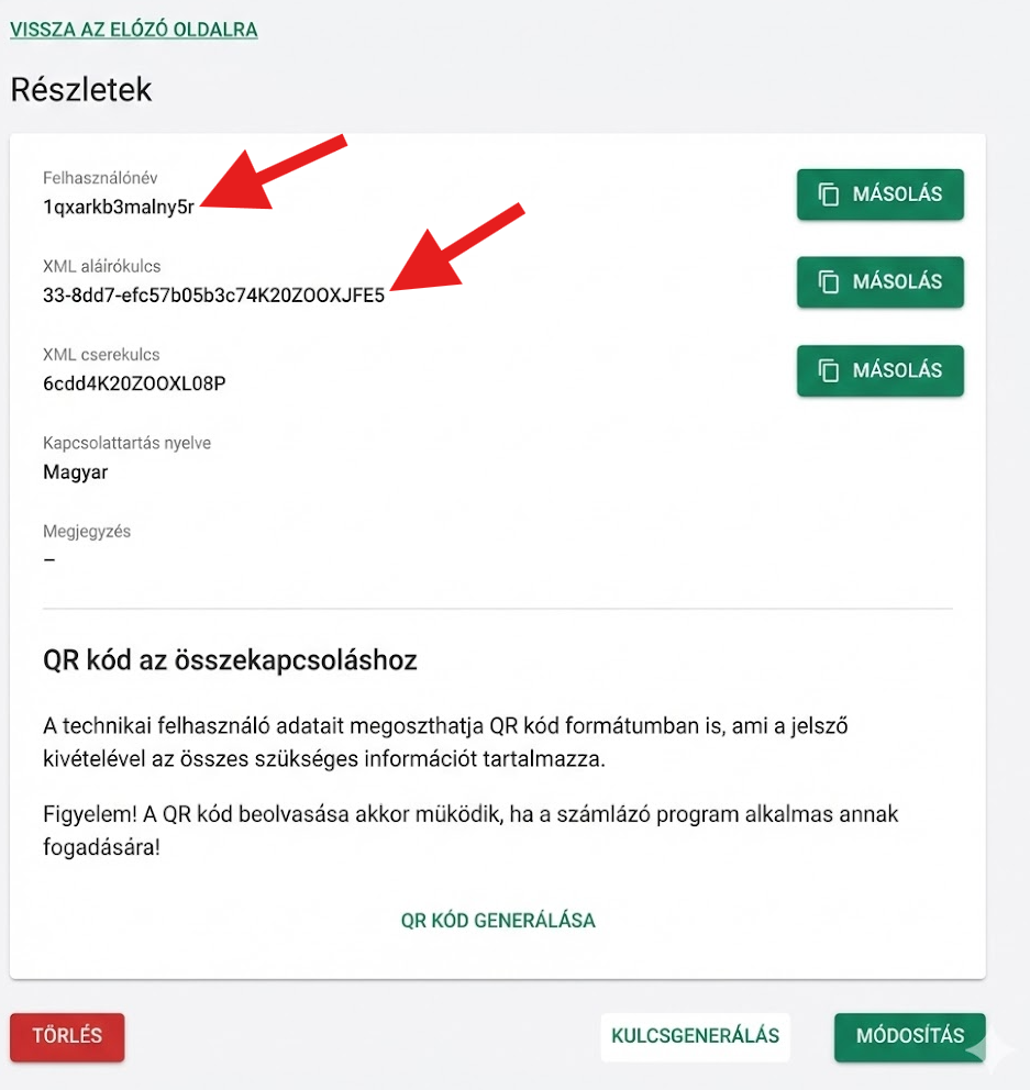 Itt láthatod a létrehozott XML aláíró és cserekulcsot, valamint a felhasználónevet. Ezekből az adatokból a Felhasználónévre és az XML aláírókulcsra lesz szükséged a CloudERP-ben. A következő lépésekben mutatjuk, hova kell ezeket bemásolni.