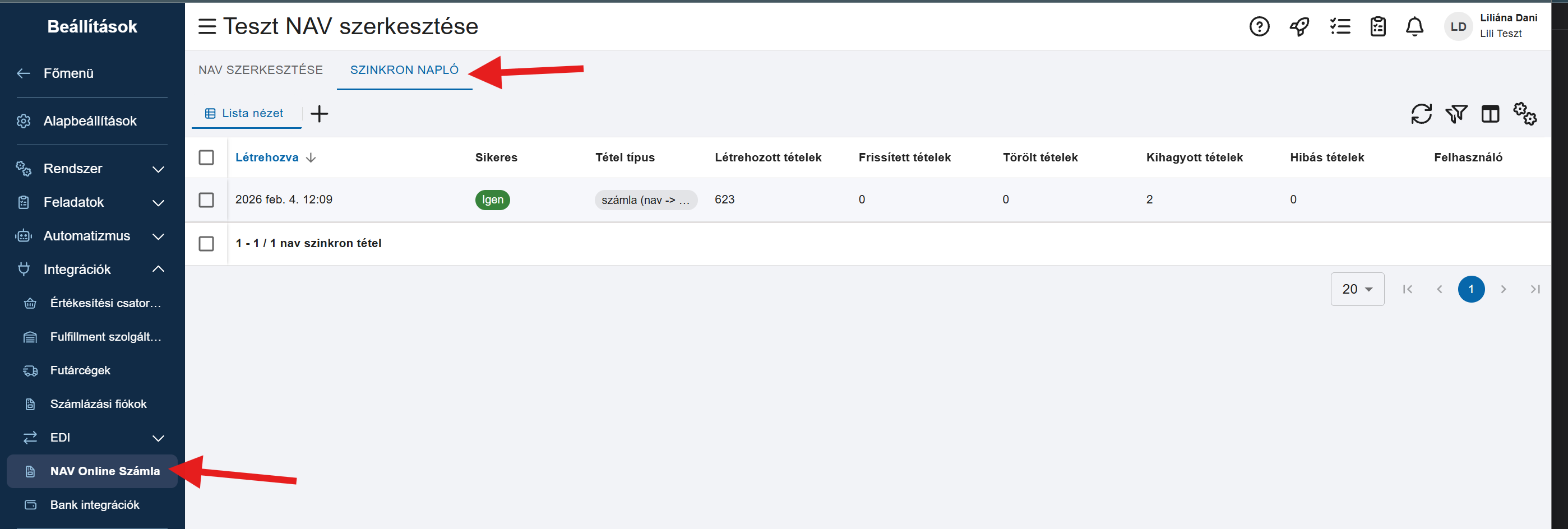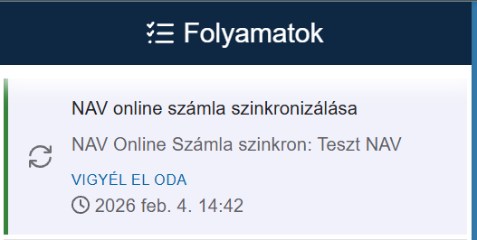 Ha sikeres volt a számlák szinkronizálása, akkor ezt a Folyamatok menüben is látni fogjuk, illetve a NAV Online Számla fiók beállítások menüben, a Szinkron napló fül alatt.