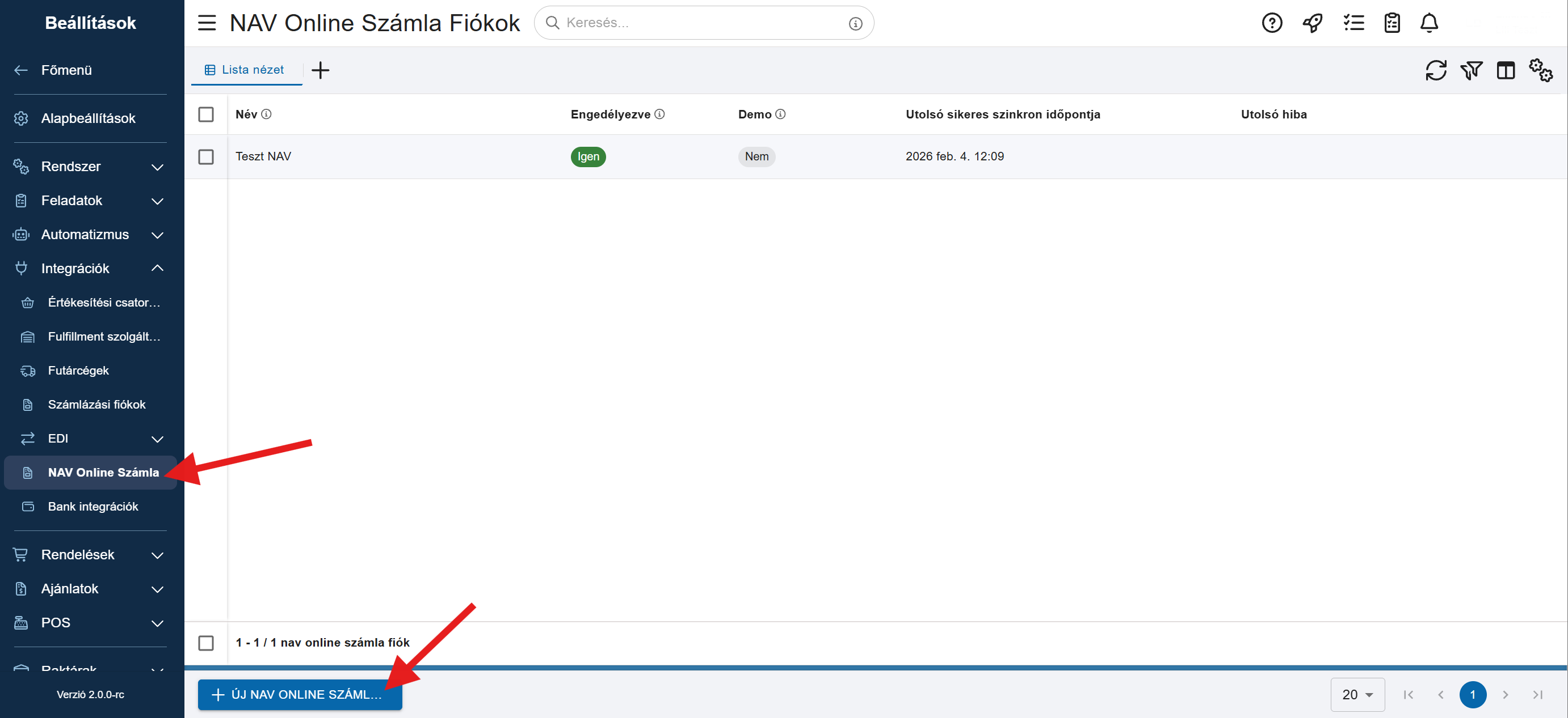 A Beállítások/ Integrációk/ NAV Online Számla menüben szükséges létrehoznunk egy új fiókot, ami arról fog gondoskodni, hogy a megadott technikai felhasználó adatokkal lekérdezi a bejövő és CloudERP-n kívül kiállított kimenő számláit a cégnek.