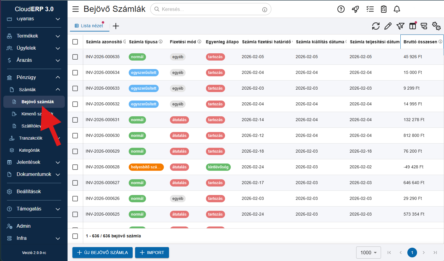 Továbbá a számlák a Pénzügy/ Számlák/ Bejövő számlák és Kimenő számlák menüben is elérhetővé válnak.