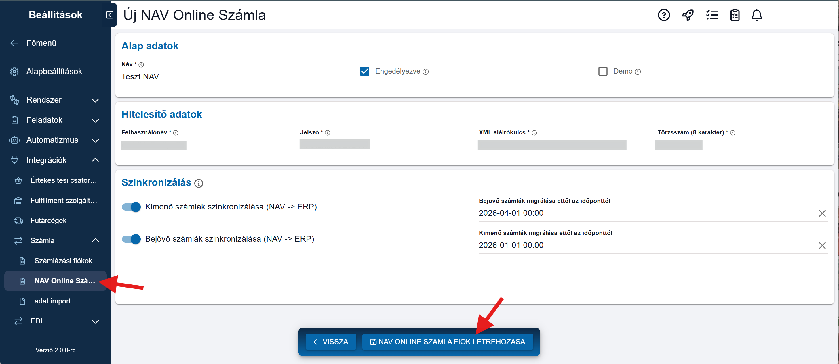 Engedélyezve: Ha engedélyezzük a fiókot, akkor a mentés után megpróbálja a rendszer a rendelkezésre álló adatok alapján lekérdezni a számlákat.