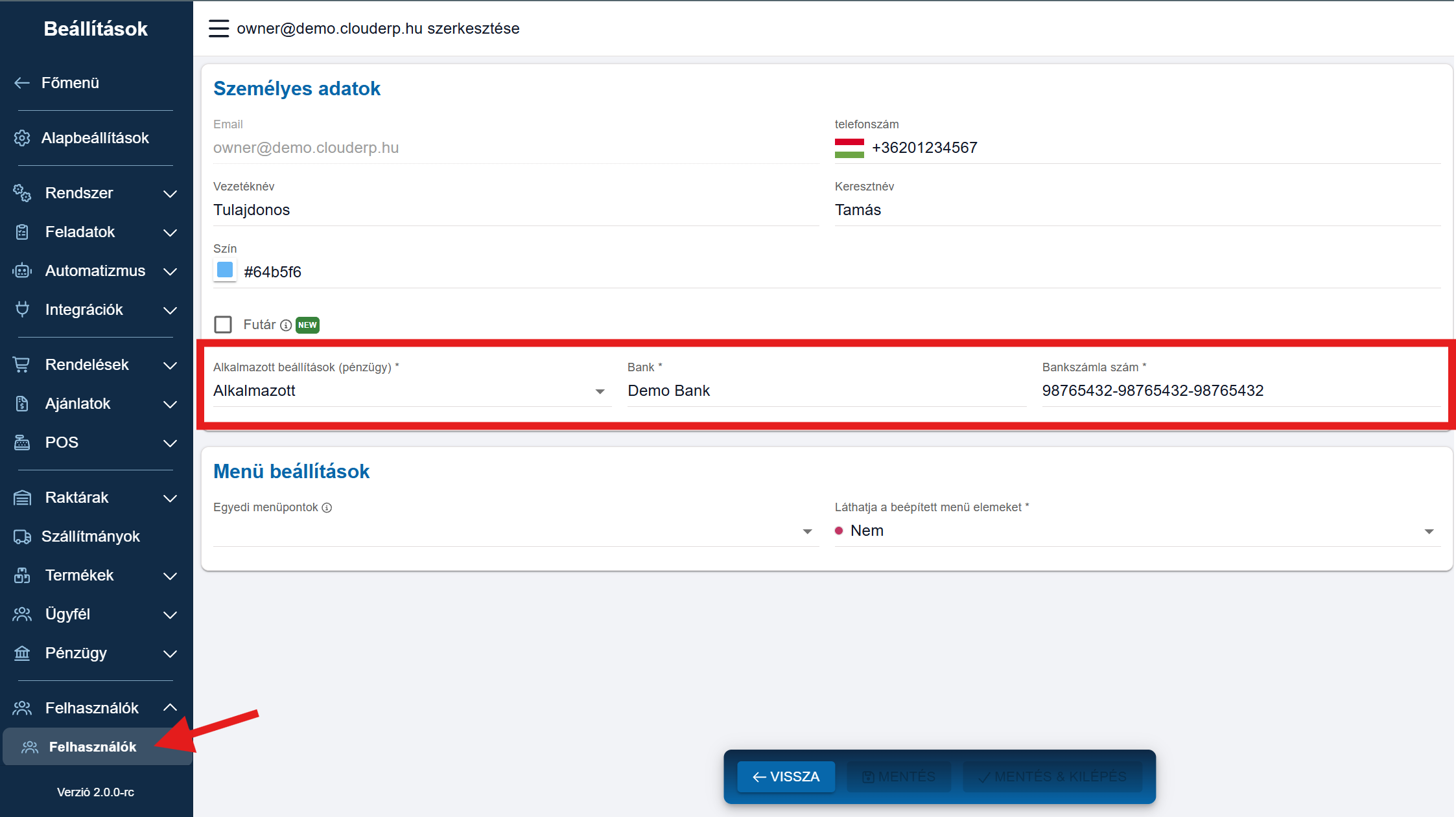 A Felhasználók / Felhasználók menüben adható meg, hogy az adott felhasználói fiók alkalmazotthoz tartozik-e.