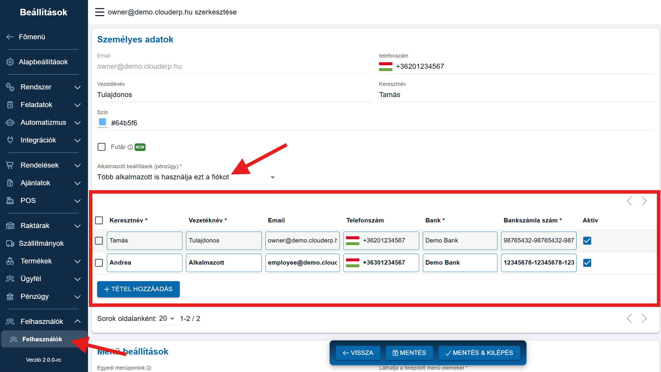 Ha a fiókot több alkalmazott használja (pl. kasszában dolgozók közös fiókkal), akkor egy táblázatban lehet rögzíteni az alkalmazottakhoz az alábbi adatokat: