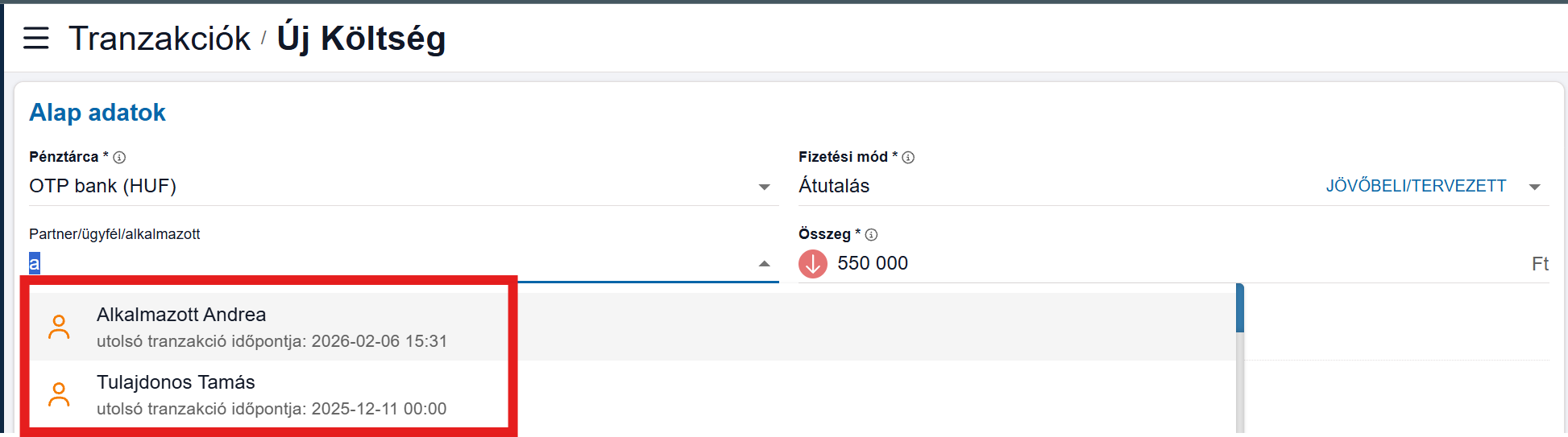 Ahogy ebben az esetben látható is új költség rögzítése során a két alkalmazott külön jelenik meg, mindenkinek egyedileg lehetséges tranzakciót rögzíteni, sőt a rendszer megjeleníti azt is, hogy mikor volt az adott alkalmazotthoz kapcsolódóan utoljára tranzakció.