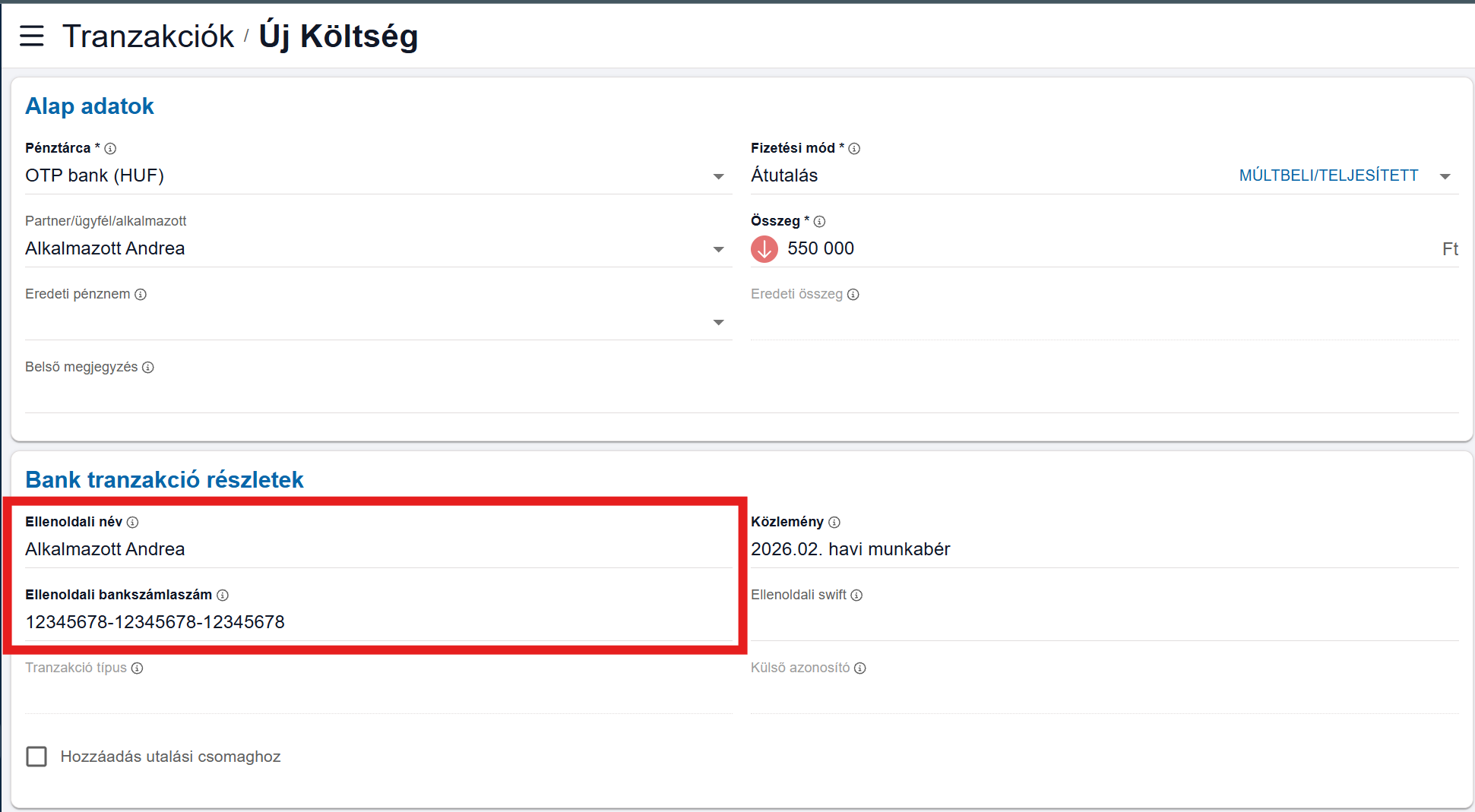 Ha pedig kiválasztjuk az alkalmazottat és átutalásos fizetési módot választunk ki, akkor a megadott banki adatokkal automatikusan kitöltésre kerül a banki tranzakciós részletek blokk, ezzel könnyítve a munkánkat.