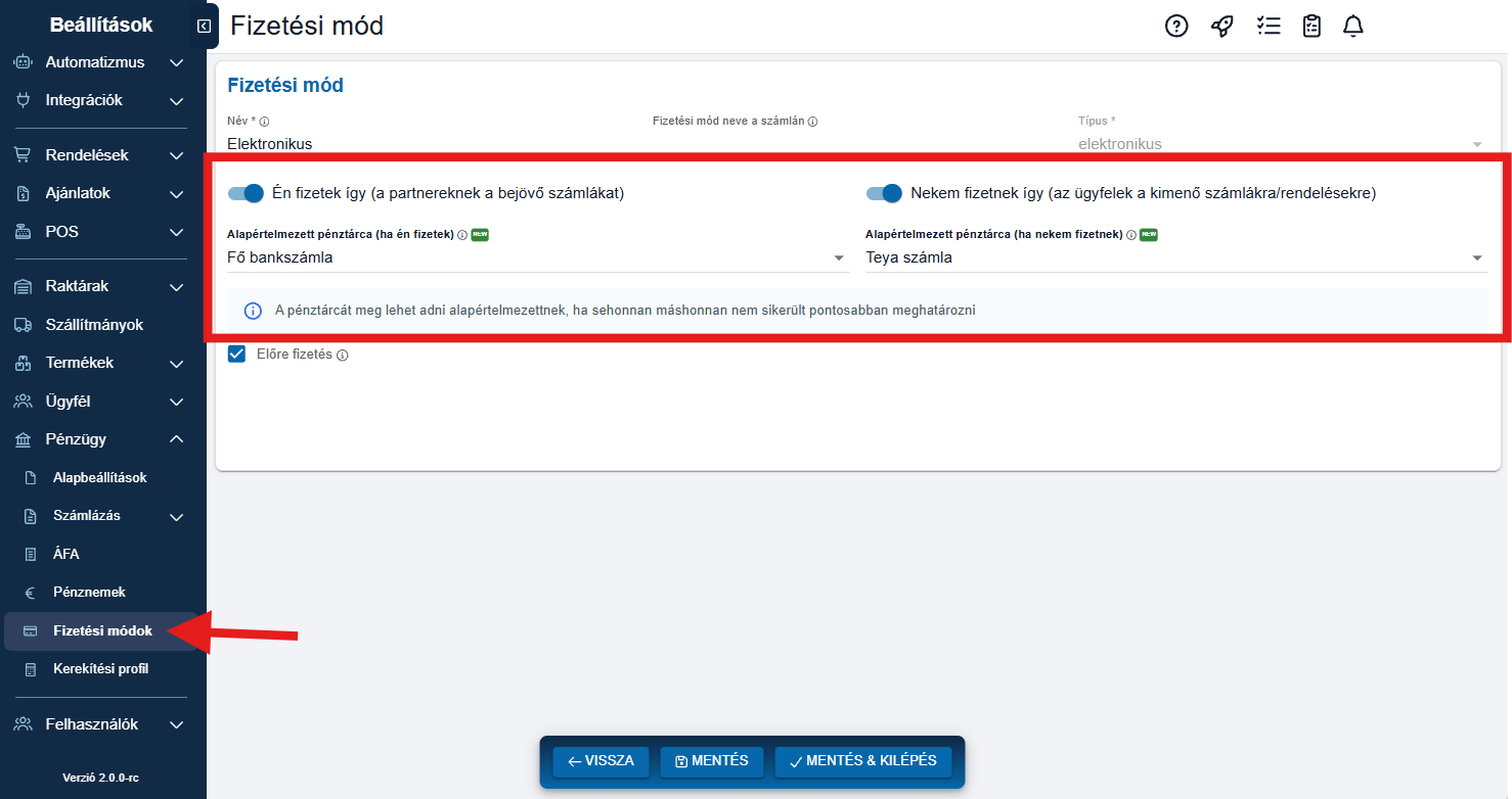 - Új pénztárca automatikus létrehozása: ha a szükséges pénztárca még nem létezik, a rendszer automatikusan létrehozza azt a fizetési módhoz kapcsolva.