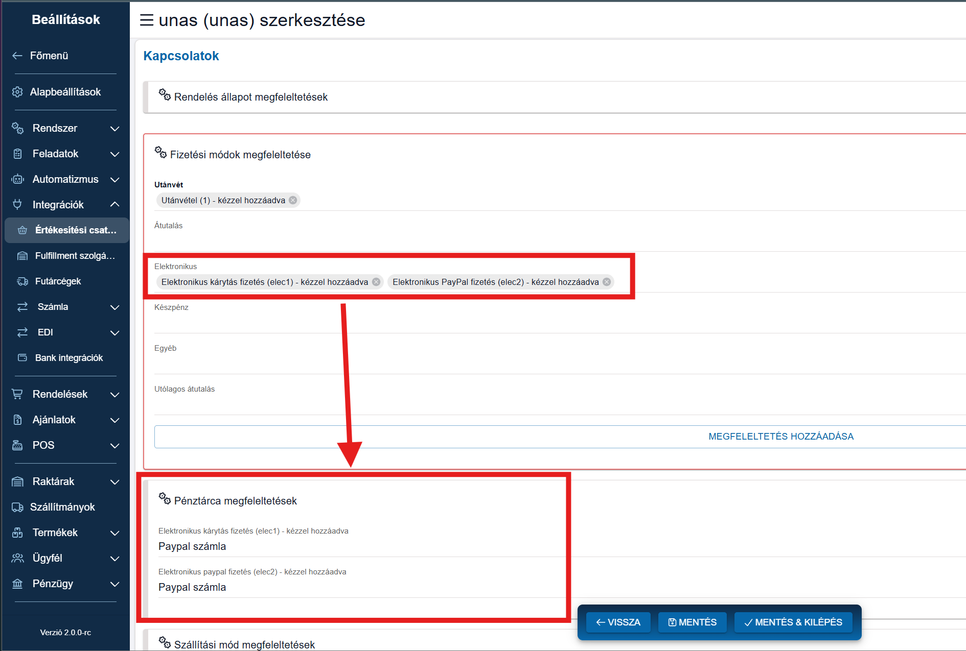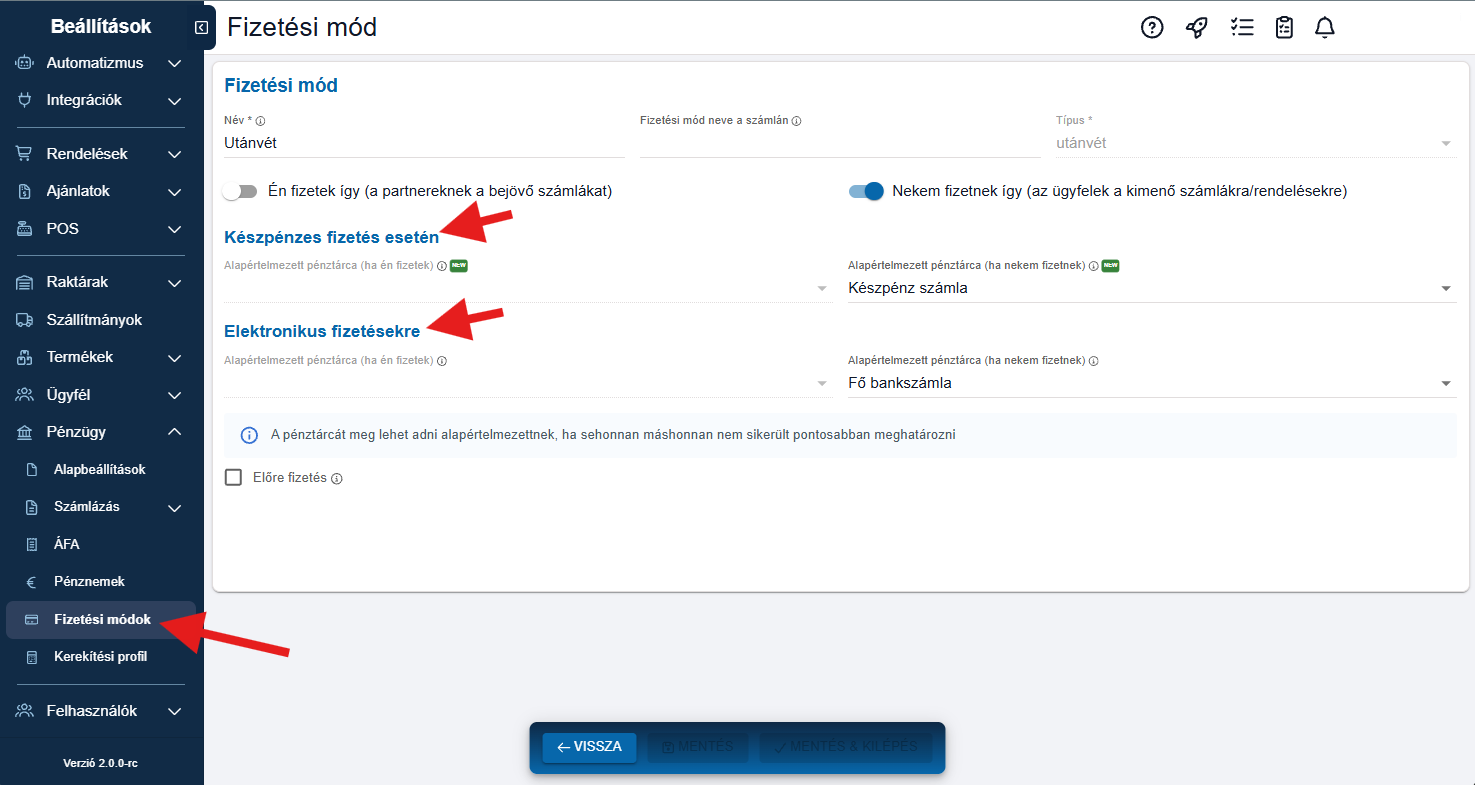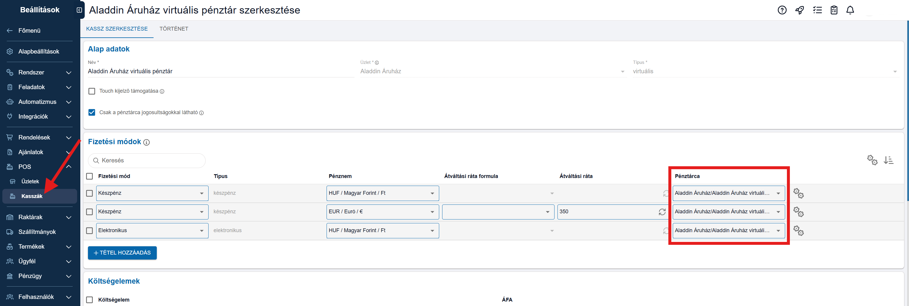 - Itt minden kasszához külön fizetési módok rendelhetők.