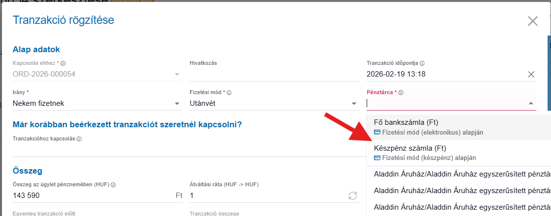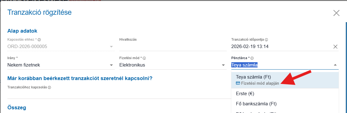 Tehát ha rögzíteni kívánunk az adott ügylethez egy tranzakciót, akkor ha semmi másból nem tud kiindulni a rendszer, akkor a fizetési mód alapján javasolja, hogy melyik pénztárcát válasszuk.