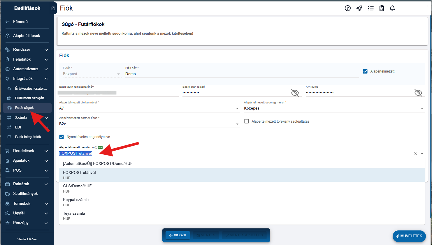 Mivel ez a két mód különböző pénztárcákat érinthet (pl. egy futár pénztárcája vs. egy bankszámla), az utánvétnél 4 db pénztárca konfigurálására van lehetőség: