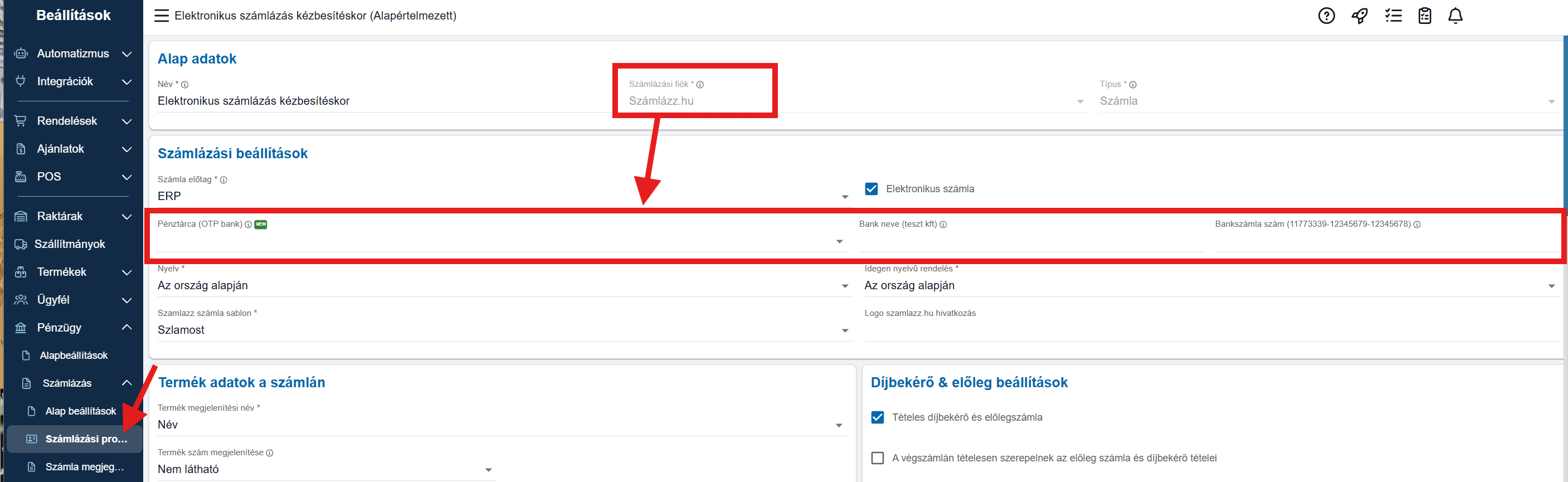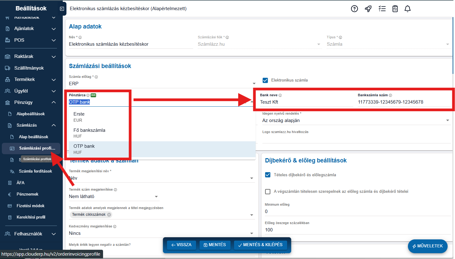 A folyamat egyszerűsítése érdekében a bank neve és számlaszám helyett mostantól közvetlenül egy Bankszámla típusú pénztárca rendelhető a számlázási profilhoz.