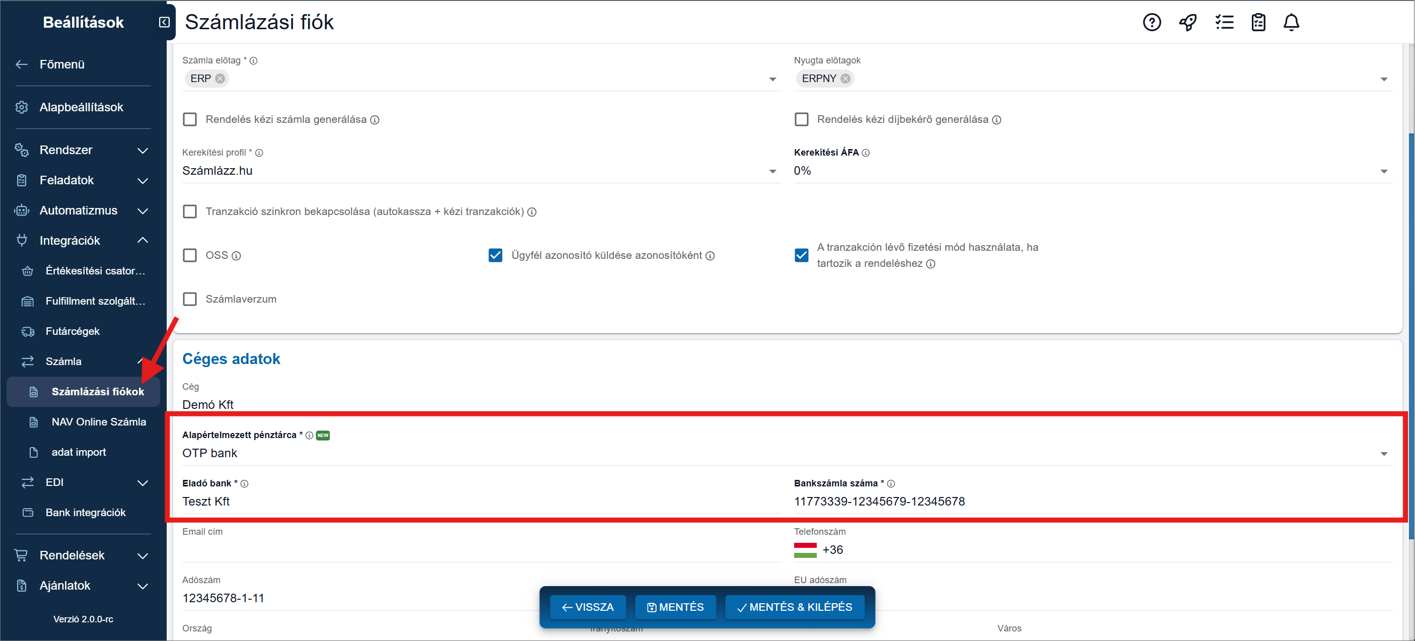 A számlán megjelenő banki adatok is a pénztárca beállításai alapján töltődnek ki (bank neve, bankszámlaszám).