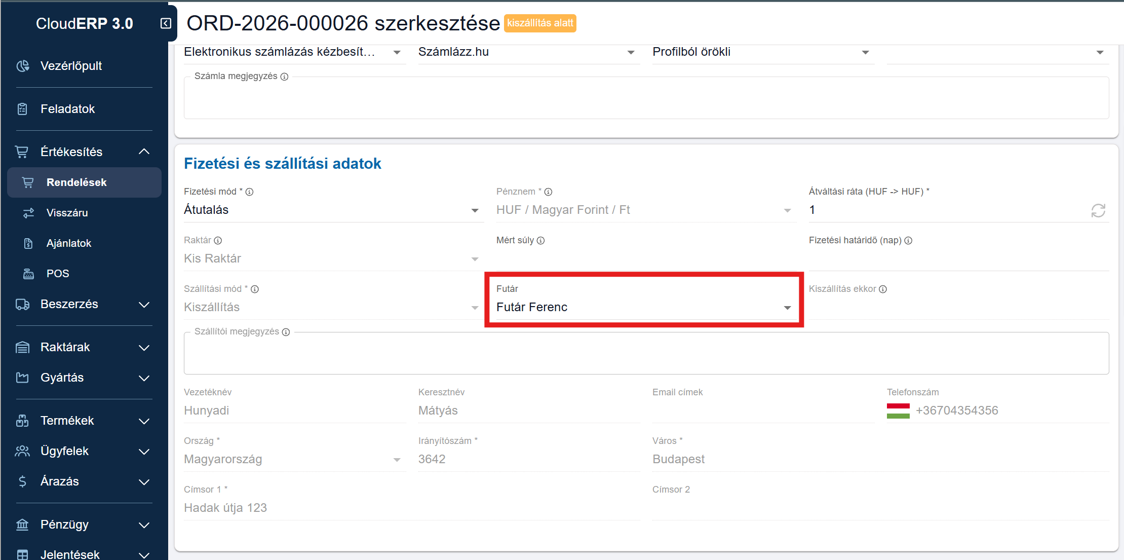 A sikeres beállítás után a rendelés adatlapján elérhetővé válik egy választómező, ahol kijelölhetjük, melyik futár fogja kézbesíteni a csomagot.