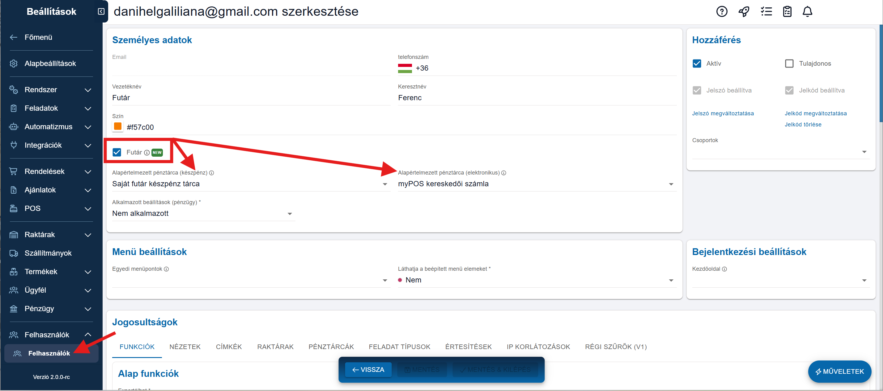 A felhasználó adatlapján jelöljük be a Futár mező melletti jelölőnégyzetet.