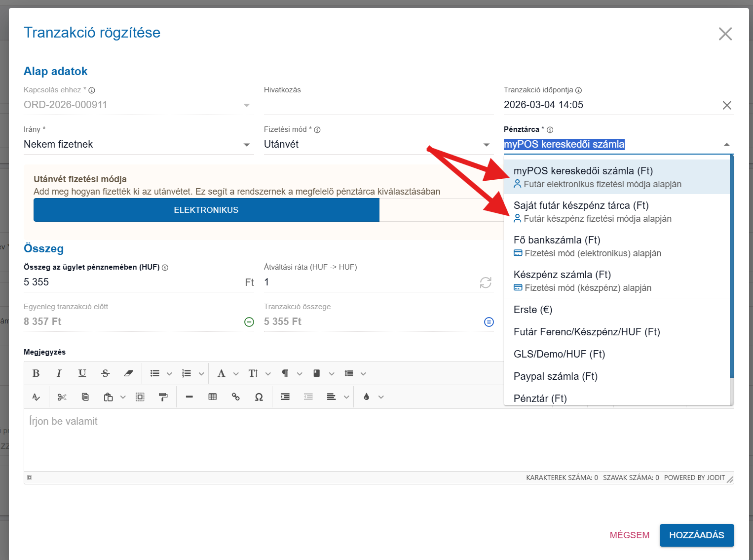 Automatikus kitöltés: A rendszer a rendeléshez tartozó futárhoz korábban beállított pénztárcákat fogja felajánlani.