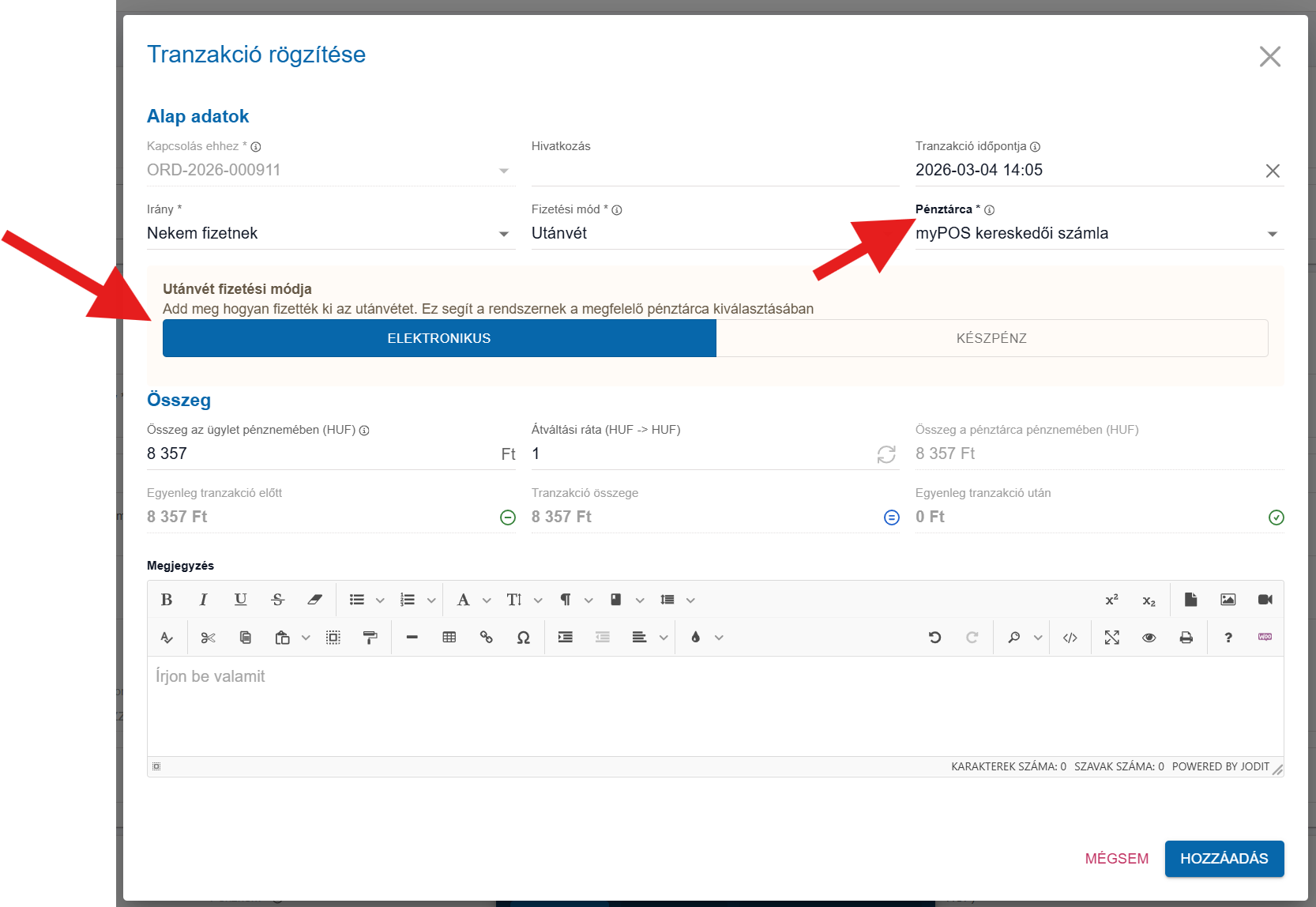 Amennyiben egy rendelés adott kasszából, adott fizetési móddal jön létre, a hozzá tartozó tranzakció automatikusan a megfelelő pénztárcába kerül.