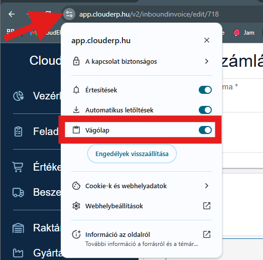 Megoldás: A böngésző címsorában a weboldal címe mellett kattints a lakat (vagy beállítások) ikonra, és a "Vágólap" (Clipboard) opciót állítsd Engedélyezés állapotba. Az oldal újratöltését követően a funkció gombnyomásra, beillesztés nélkül is működni fog.