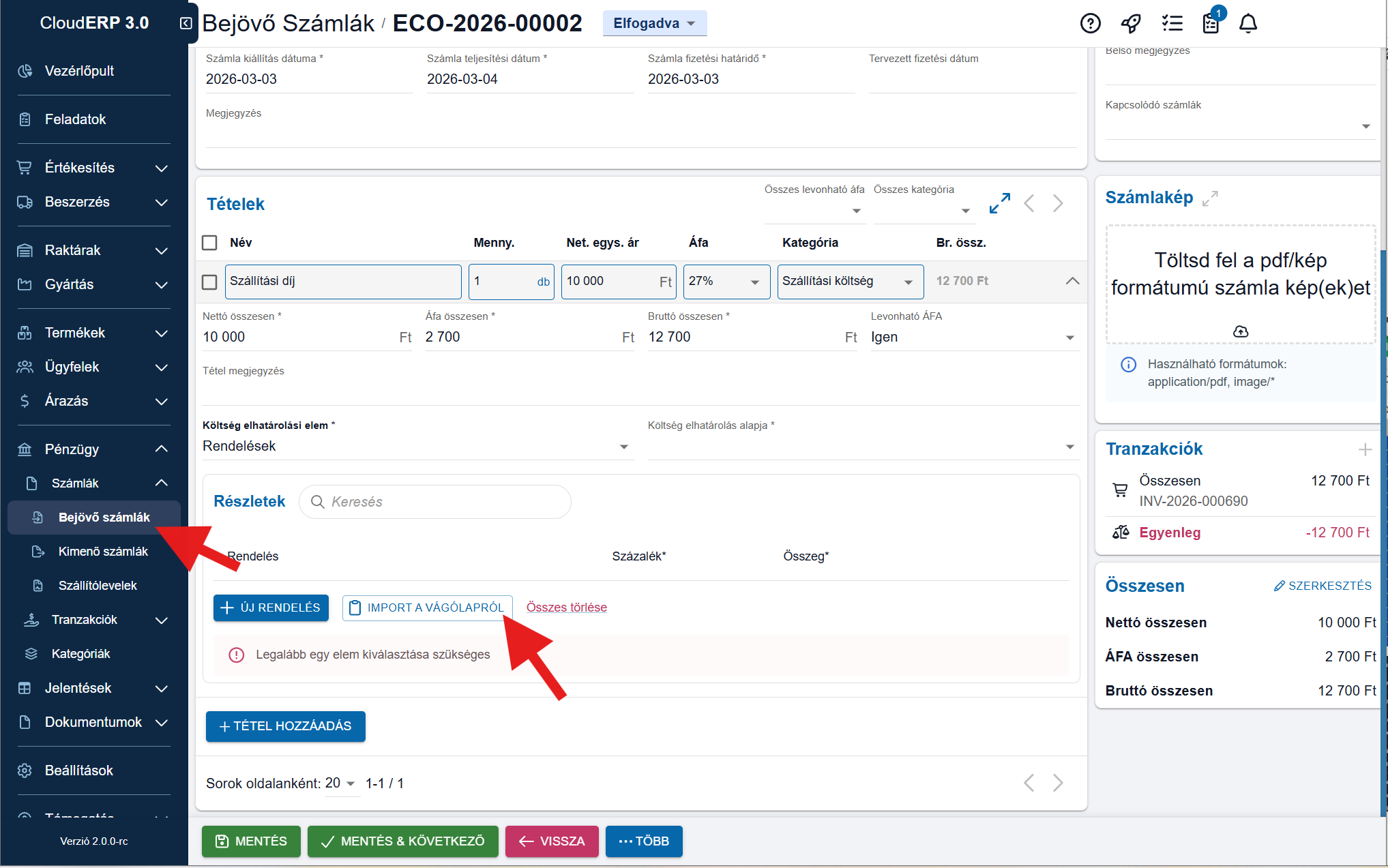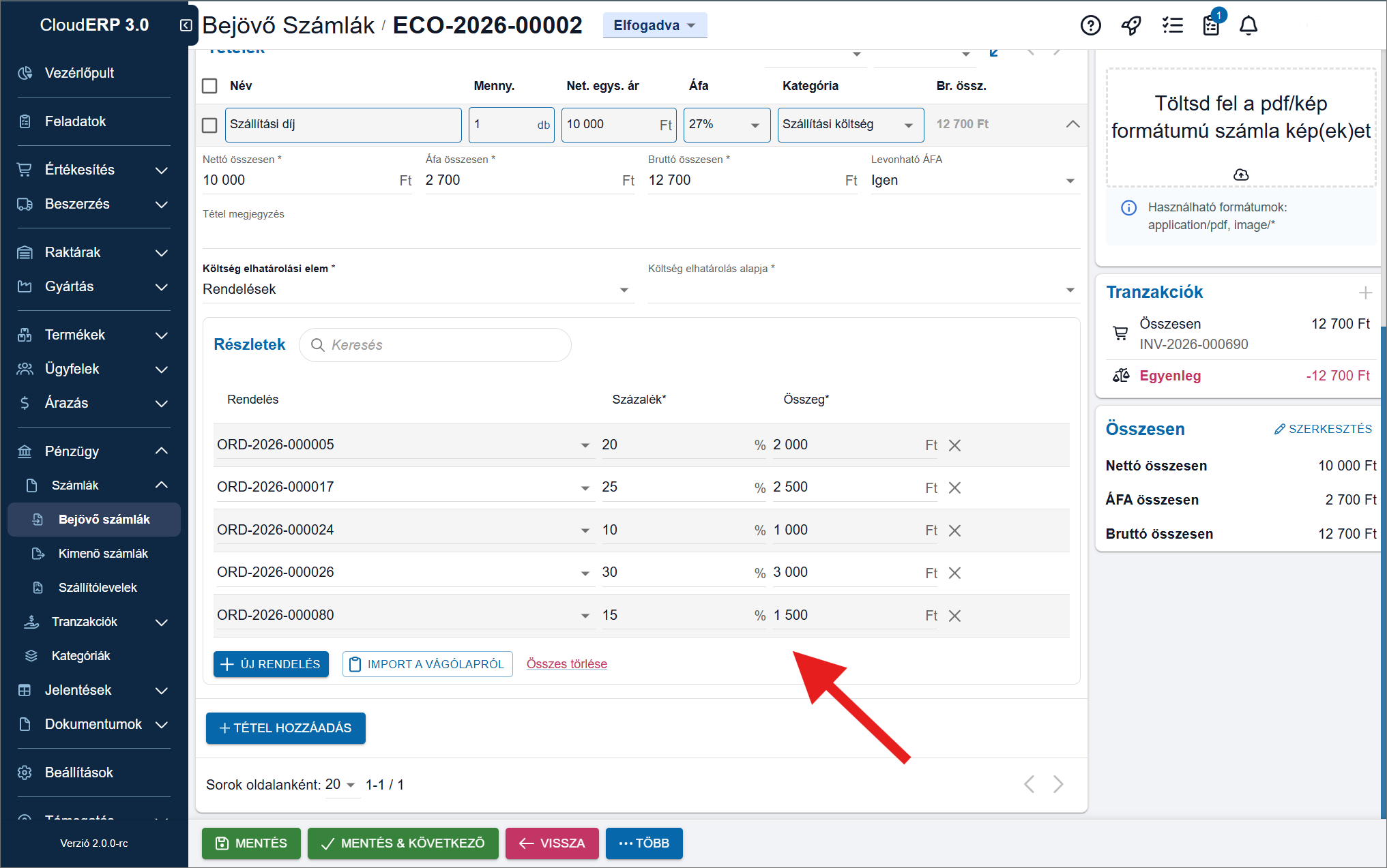 Bejövő és kimenő számla oldalon (rendelések költségallokációja)