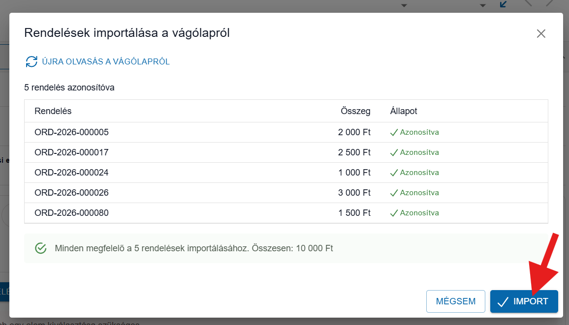 Amint az adatok zöld jelzést kapnak (a rendszer megtalálta a rendeléseket és az összegek is stimmelnek), kattints az Import gombra. A rendszer ekkor a rendeléseket a megadott összegekkel hozzárendeli az érintett tételekhez.