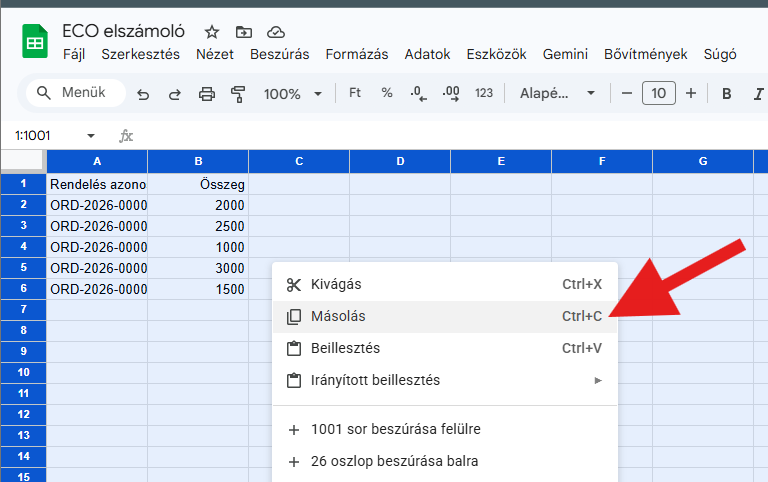 Nyisd meg a külső forrást (pl. Excel, Google Sheets). Jelöld ki a vonatkozó adatokat. Például a rendelésazonosítót és a hozzá tartozó összeget, majd nyomd meg a Ctrl + C billentyűkombinációt a másoláshoz.