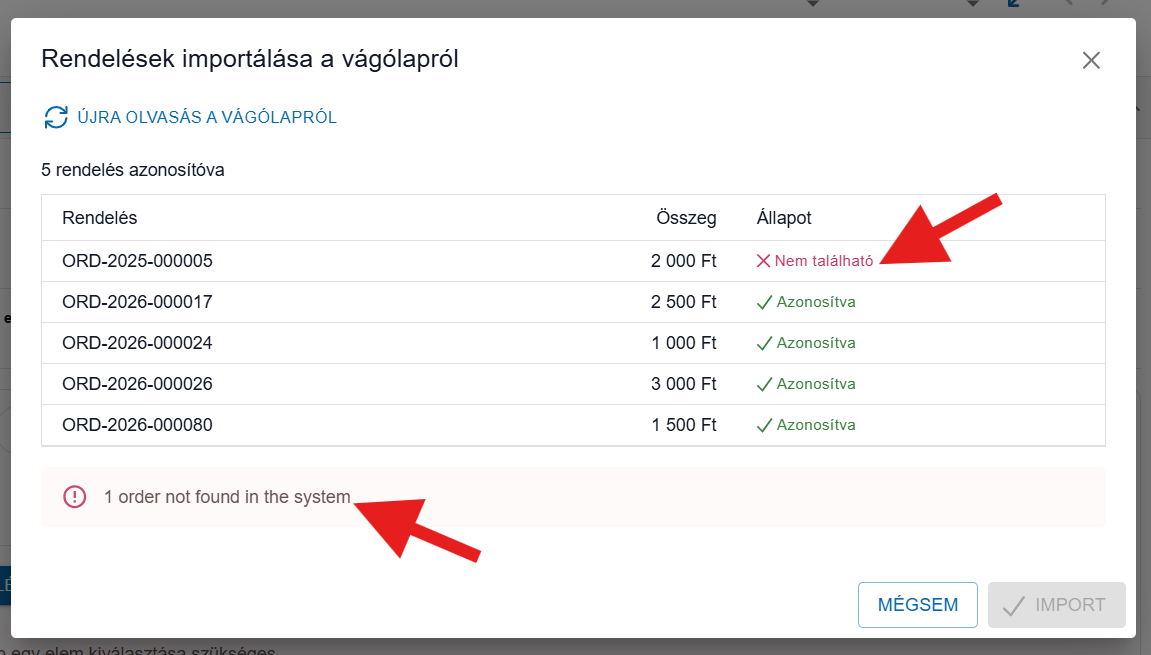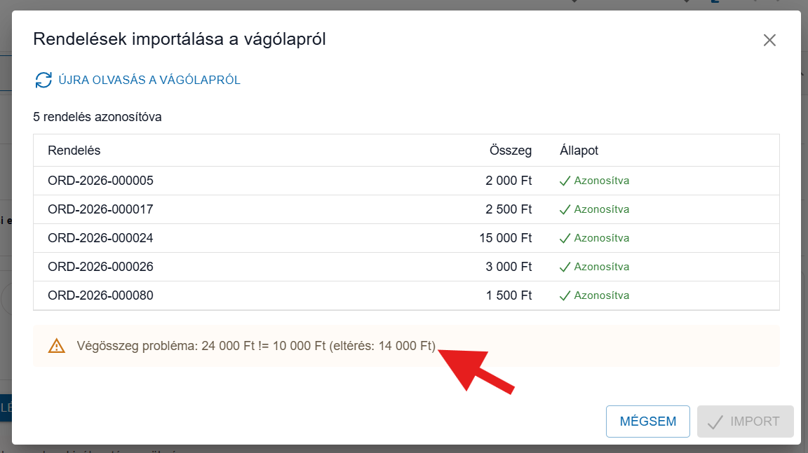Ez a hiba akkor fordul elő, ha a vágólapról beolvasott rendelések összege nem egyezik meg a rendszerben szereplő elem (számla vagy tranzakció) teljes összegével.