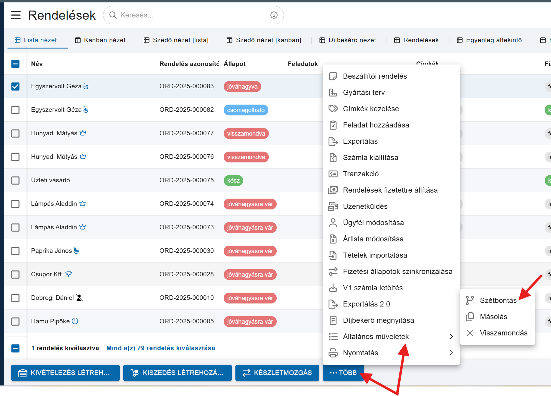 A rendelés ettől függetlenül a műveleti sávban található Több -> Általános műveletek -> Szétbontás művelettel szétbontható.