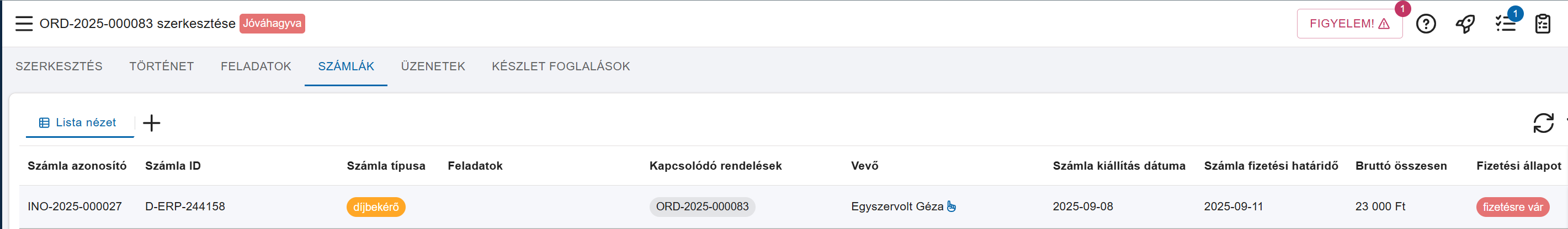 Ahogy az alábbi képen is látható az ORD-2025-000083 rendeléshez tartozik már egy díjbekérő.