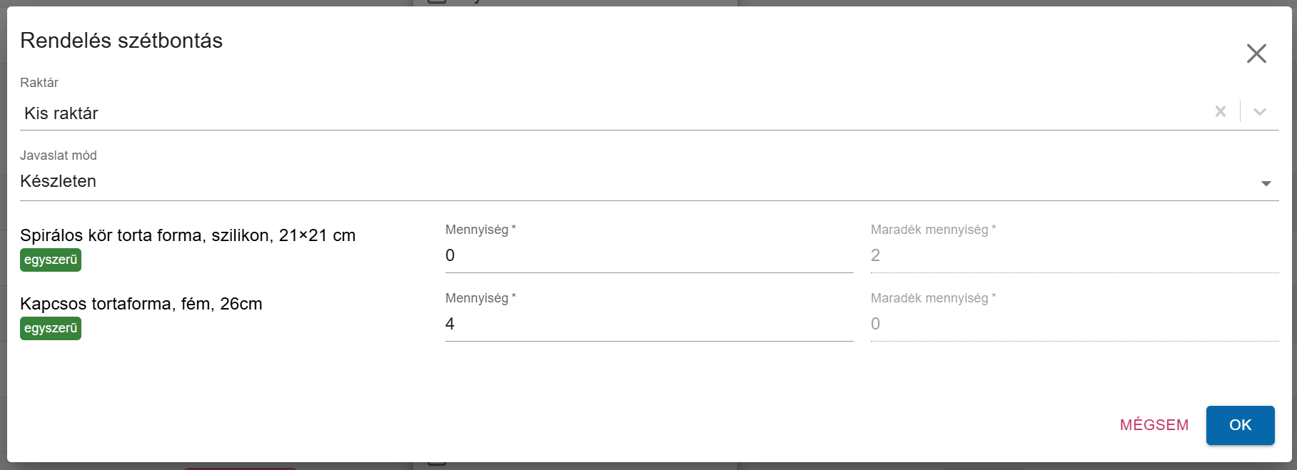 A szokott módon adjuk meg, hogy mi alapján szeretnénk szétbontani, amely eredményeképpen létrejön két új rendelés.
