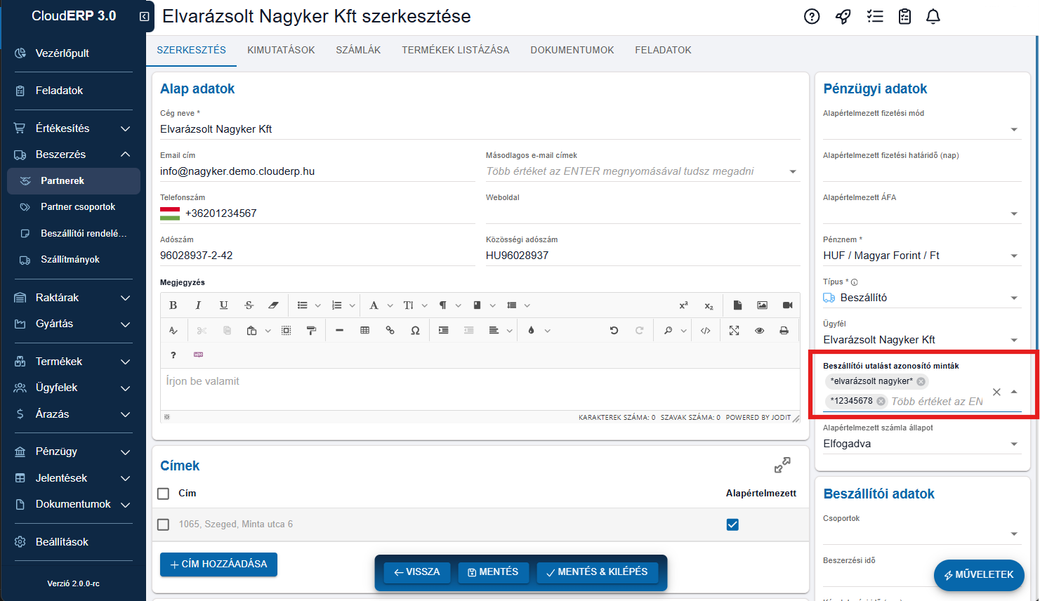 Normál beszállítói utalásnál viszont általában nem ez a legjobb megoldás. Ha egyszerűen utalsz egy partnernek, akkor a rendszer a partner bankszámlaszáma alapján sokkal megbízhatóbban tud azonosítani. Emiatt a beszállítói minták inkább kiegészítő eszközök, nem az elsődleges azonosítási mód.