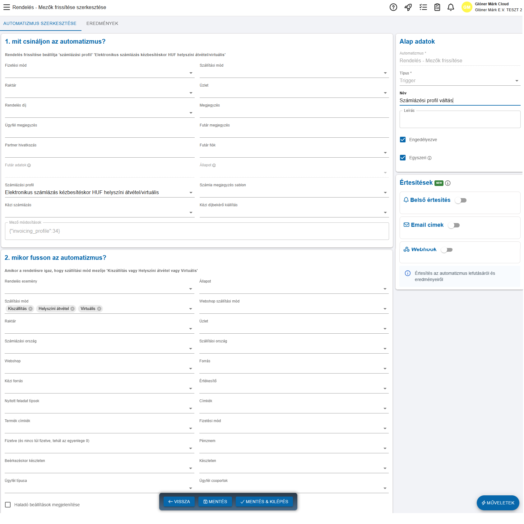1/A. Ha például van egy olyan számlázási profilunk, amit akkor használunk, amikor futászolgálattal küldünk egy rendelést és a címke nyomtatva a számla elkészítési pontja, és van egy olyan számlázási profilunk, amit személyes átvéleles és saját futáros (kiszállítás száll. mód) és virtuális szállítási módú rendelésekre használunk és a kész állapot az elkészítési pontja, akkor a két profil között tudunk váltani automatizmus segítségével. A feltétel itt a szállítási mód lehet. Alapértelmezett számlázási profil lehet az első és a második profilt kell automatizmussal átállítani.