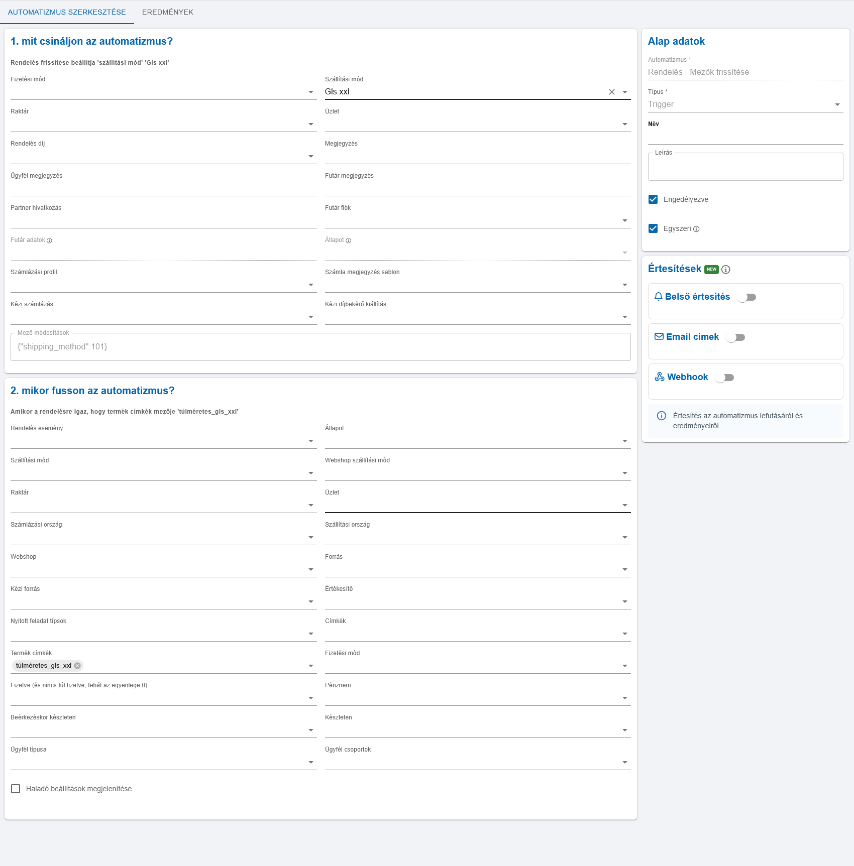 1/G. És akkor is érdekes lehet a mező frissítő automatizmus, ha át szeretnénk állítani mondjuk a szálítási módot GLS kiszállításról GLS XXL-re akkor, ha a rendelésben olyan termék van, ami túl nagy a normál GLS kiszálíltáshoz. Ebben az esetben először ezekre a termékekre kell egy címkét (például túlméretes) tenni a termékak menüben és utána beállítani az automatizmust így: