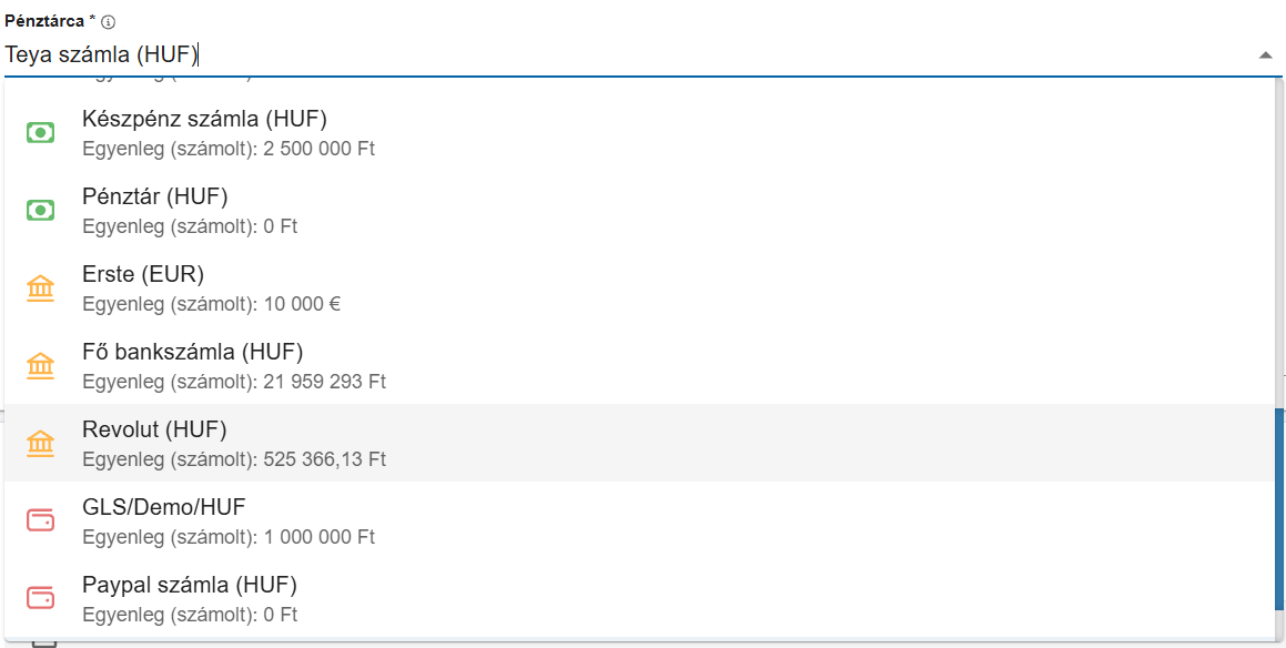 Pénztárca*: A tranzakció ebbe a pénztárcába érkezett be vagy ebből a pénztárcából került kifizetésre. Tehát itt azt a pénztárcát (bankszámlát, kasszát, stb) kell megadnunk ahova a tranzakció beérkezett/be fog érkezni vagy kifizetésre került vagy ki lesz fizetve. A pénztárcák típusai az előttük található ikonból azonnal látható:
