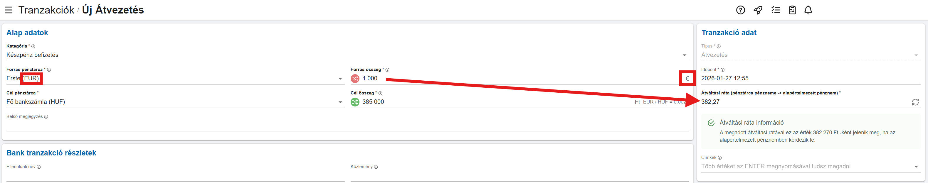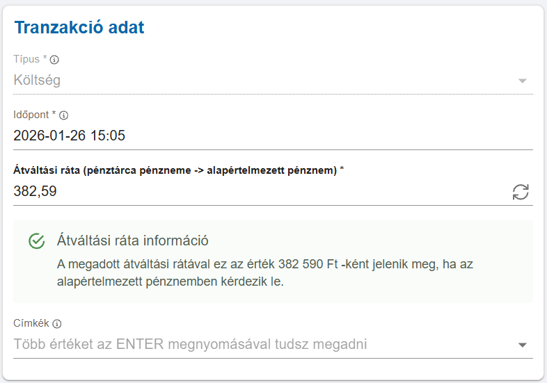 Átváltási ráta (pénztárca pénzneme -> alapértelmezett pénznem)*: Abban az esetben, ha a pénztárca pénzneme nem HUF (mivel ez a rendszer alapértelmezett pénzneme), akkor megjelenik ez a mező, ami alapértelmezetten az MNP napi középárfolyammal kerül kitöltésre, de lehetőségünk van manuális megadni egy árfolyamot, amivel a rendszer kiszámolja ebből a forintosított értéket, ez lesz a tranzakció összege az alapértelmezett pénznemben. Erről külön tájékoztat is minket a rendszer, hogy ha pl. 1000€ a tranzakció és az átváltási ráta 382,59 Ft/€, akkor ez 382 590 Ft-ként fog megjelenni. Mivel a kimutatások is forintban kerülnek kimutatásra, így ilyen esetekben érdemes az átváltási rátára figyelni.