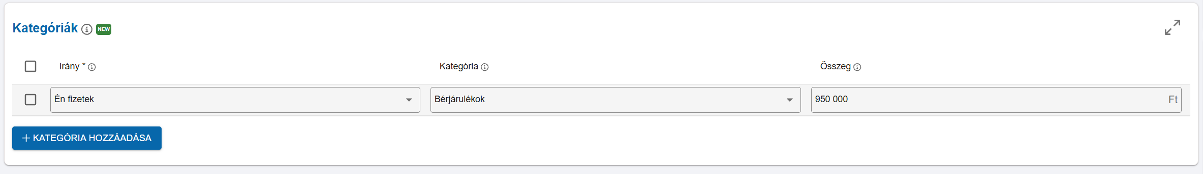 Kategória: A tranzakció kategória kialakítása során megadható, hogy milyen kategóriákba szeretnénk sorolni az egyes pénzmozgásokat. Itt tudjuk ezt kiválasztani, ami a későbbiekben segít a későbbieben ha kimutatásokat szeretnénk készíteni.