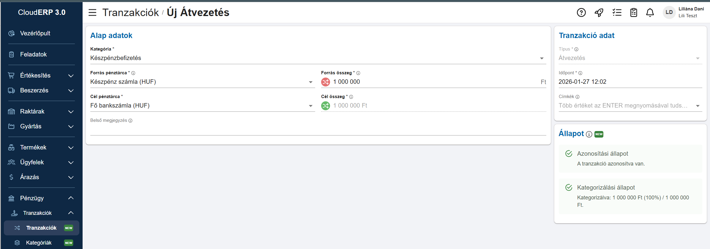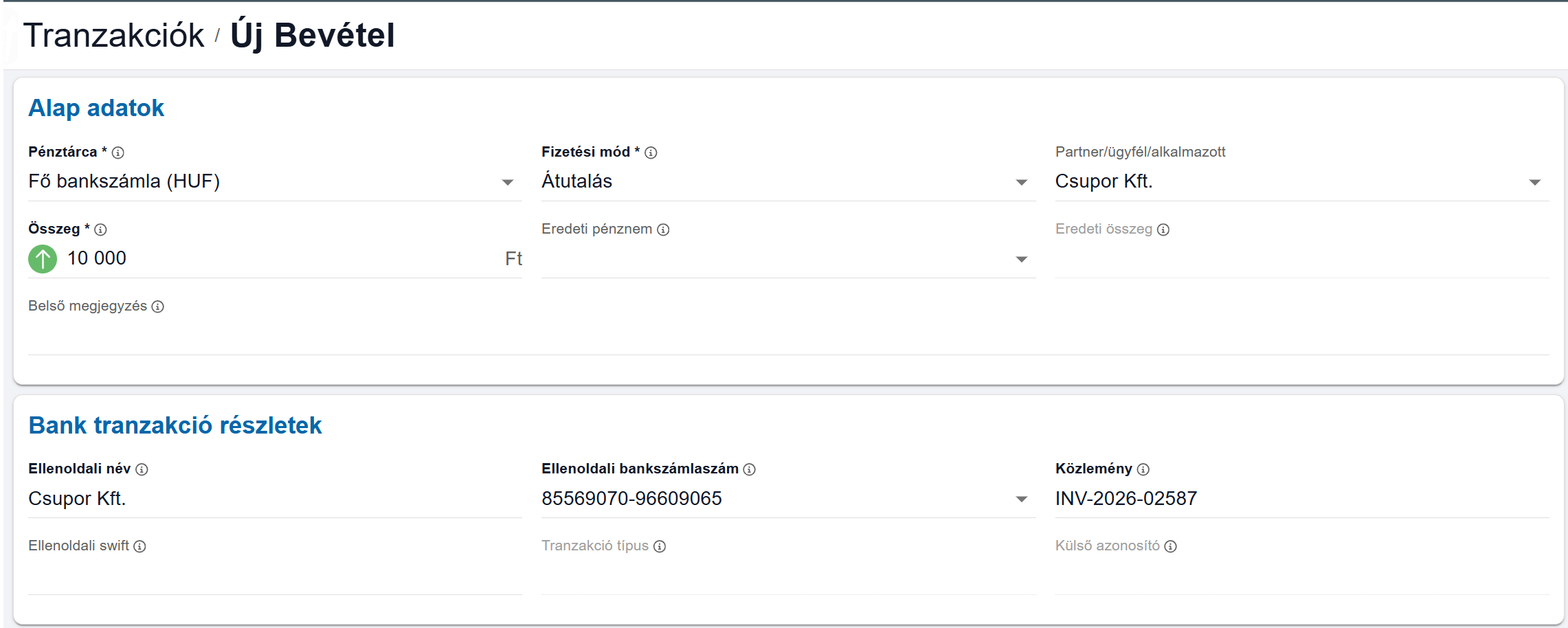 Ez manuális rögzítés esetén sok felesleges plusz adatnak tűnik, viszont bevétel típusú tranzakcióknál ezek az adatok ha bankkal összekapcsoljuk a CloudERP-t vagy éppen egy banki import fájlt töltünk fel, akkor automatikusan ki tudnak töltődni és nem kell ezeknek a rögzítésével foglalkozni. Viszont ha egy költséget rögzítünk, aminek az utalása csak ezt követően fog megtörténni, akkor javasolt a kitöltése, mivel ha minden megadunk, akkor ezeket a tranzakciókt ki tudjuk a CloudERP-ből egy utalási fájlként exportálni és feltölteni a bankba.