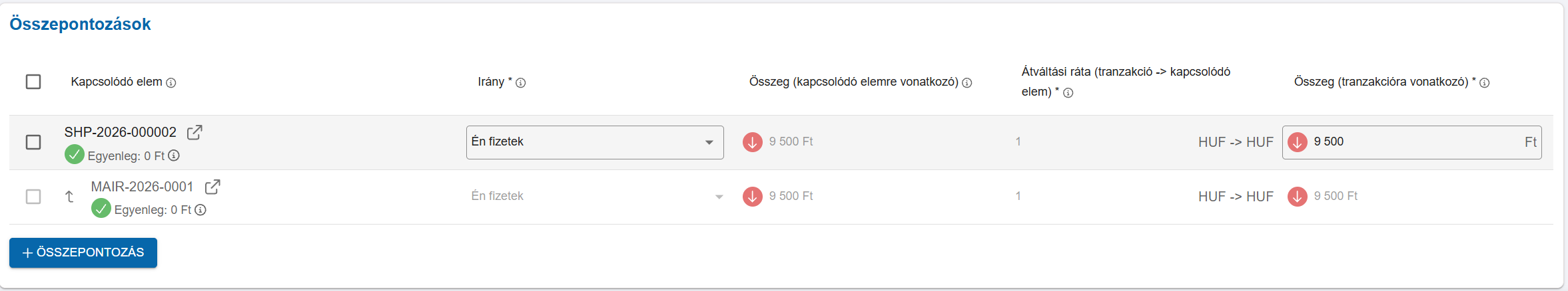 - Ügyletekből tranzakció létrehozás, tömeges fizetettre állítás