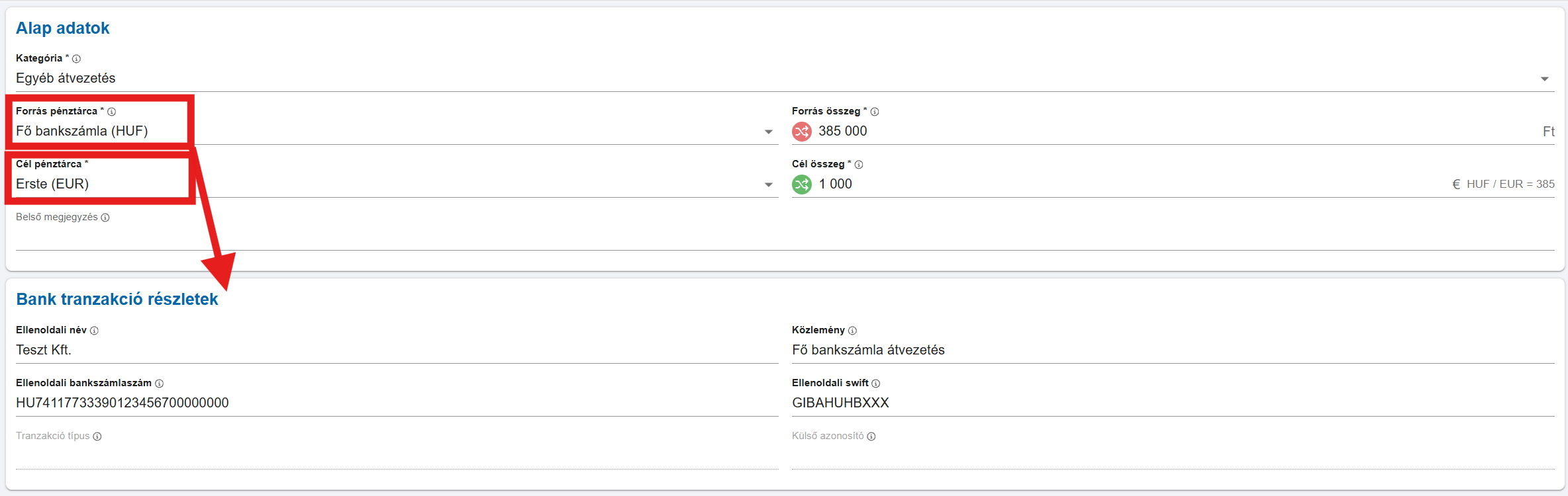 Forint váltása Euróra (vagy fordítva): Például a HUF számládról átvezetsz az EUR számládra. Itt az átvezetés segít kezelni az árfolyamkülönbségeket is.
