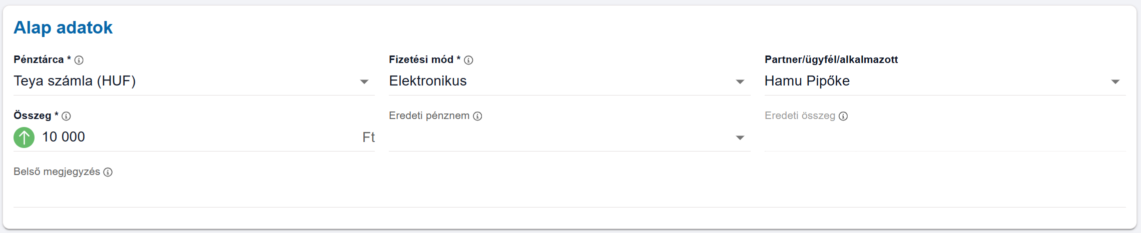 Eredeti összeg: Ha adunk meg eredeti pénznemet, akkor itt van lehetőségünk megadni, hogy mi volt az az összeg az eredeti pénznemben, amit kiegyenlítettünk ezzel a tranzakcióval. Pl. Forintos pénztárcából utalunk el egy 10€ -ról szóló előfizetést, akkor megadjuk, hogy az összeg 4000 Ft, az eredeti pénznem € és az eredeti összeg 10 €.