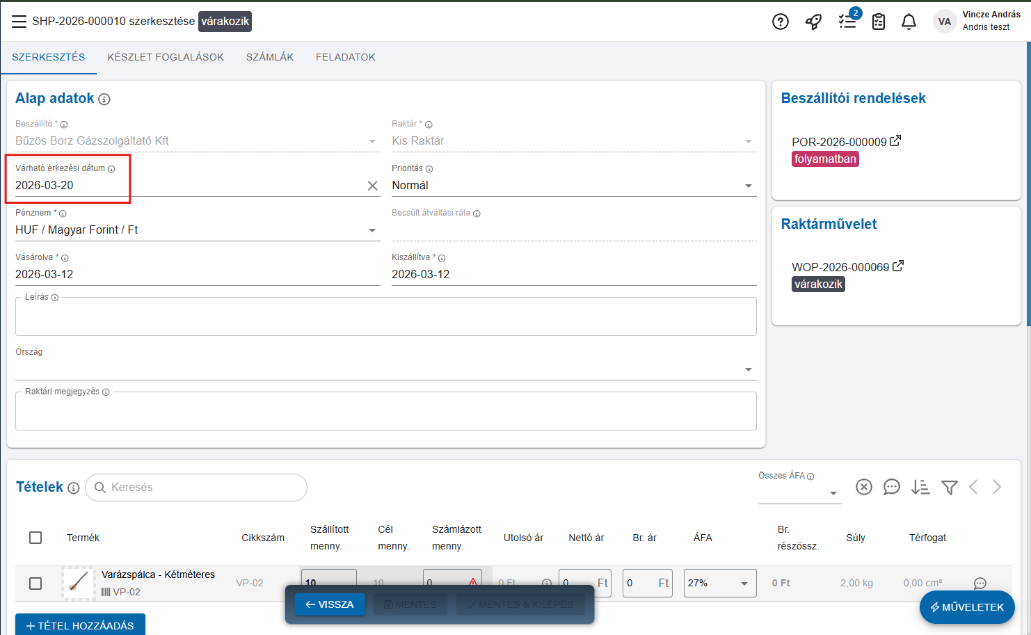 - Létrejön egy kapcsolódó raktári bevételezés (WOP)