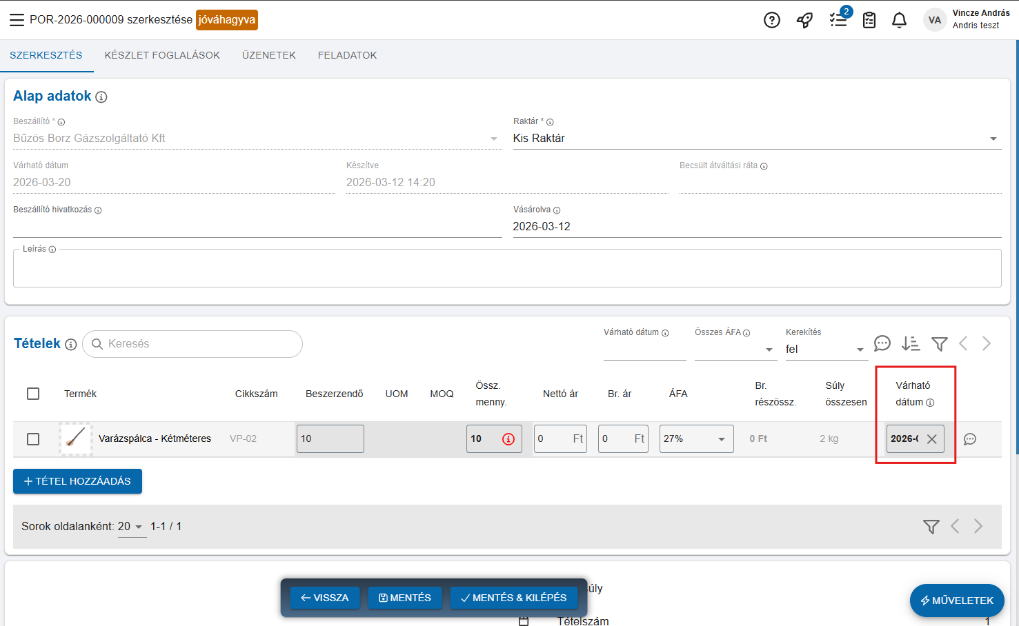 Az automatikus mennyiségek kapcsoló segítségével megadhatod, hogy a beszállítói megrendelés tételei egyből rákerüljenek- e a bevételezésre vagy majd csak a szállítmány ellenőrzése során.