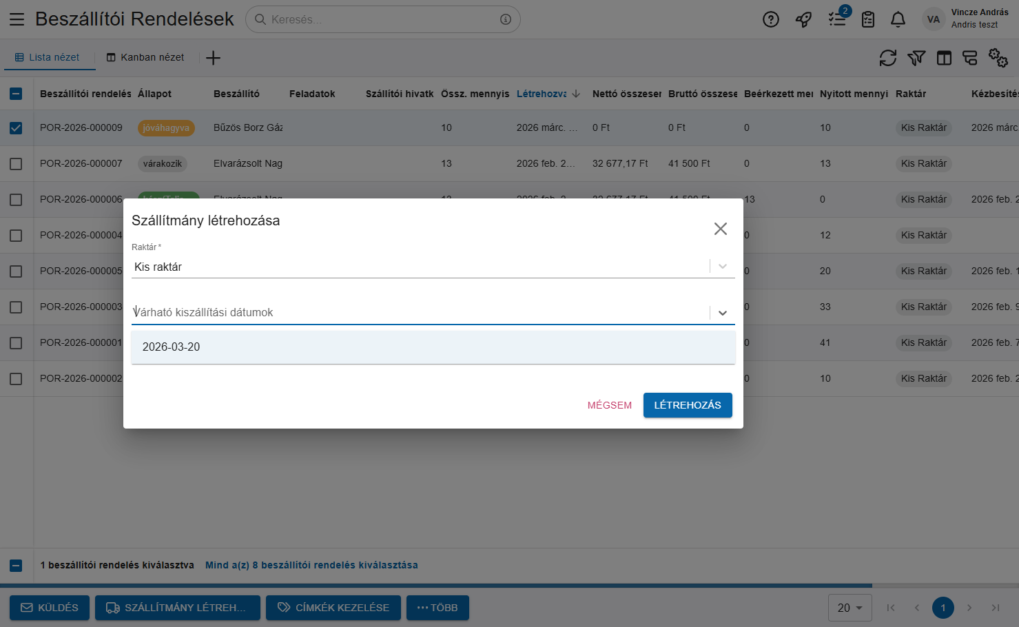 - Nyomd meg a Létrehozás gombot és elkészül a szállítmány és a hozzá tartozó bevételezés is