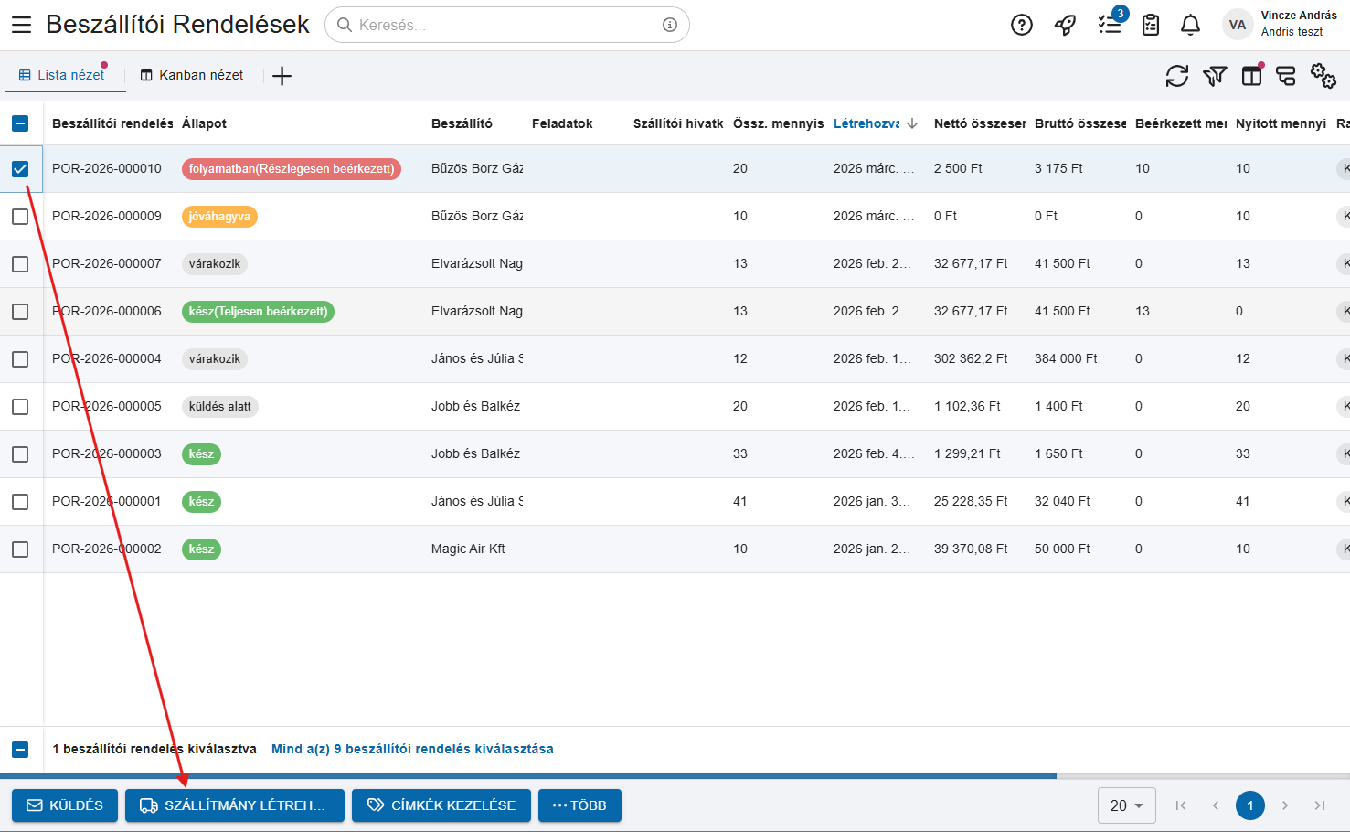 A jóváhagyás után, az utolsó lépés, hogy szállítmányt készítünk a rendelés alapján. A szállítmány segítségével lehetőségünk van egy esetleges ellenőrzésre mielőtt a raktárba kerülnek a beszállítói megrendelés tételei. A szállítmány létrehozása után a rendelés FOLYAMATBAN állapotba kerül.