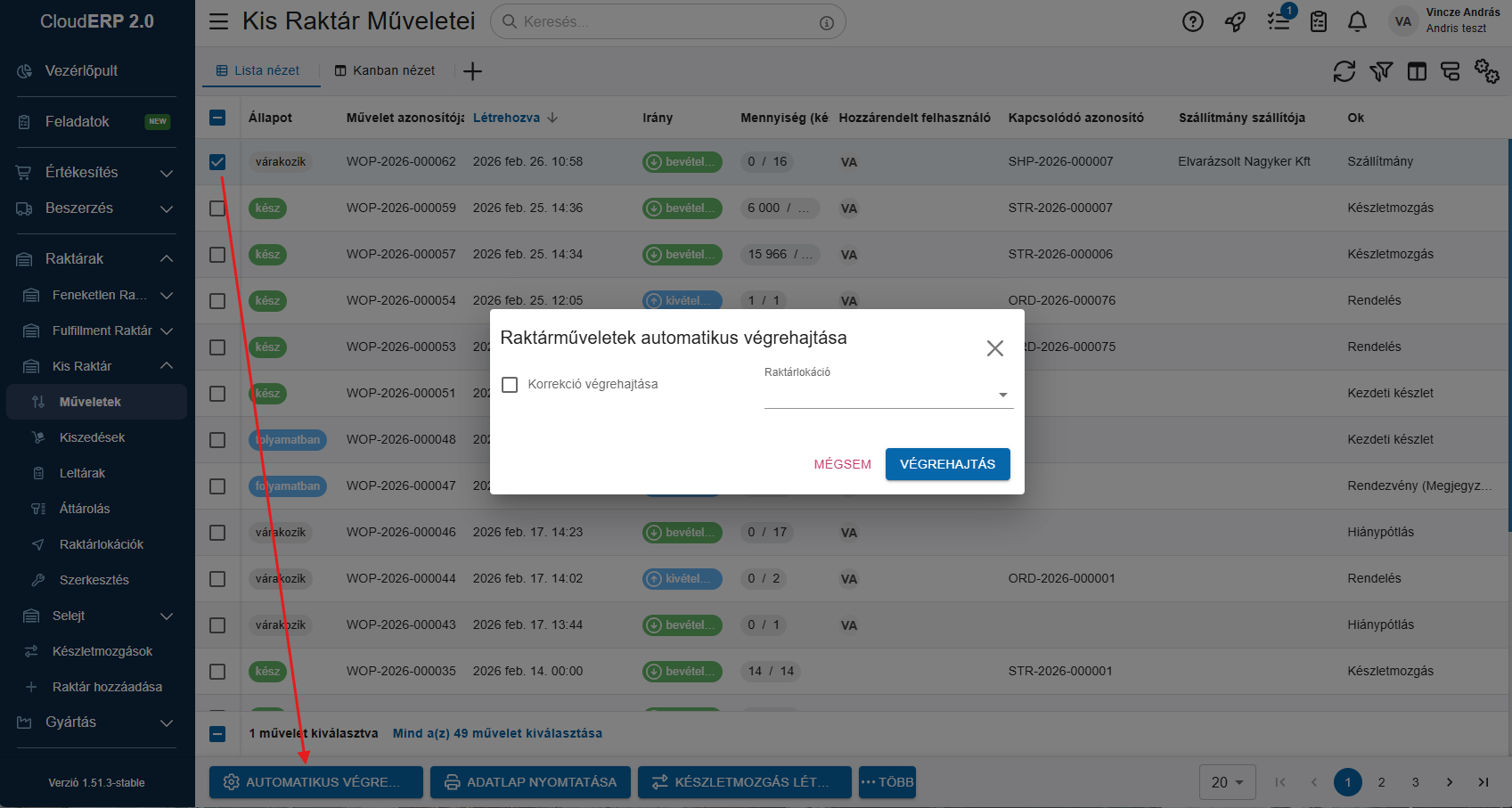 A raktárműveleteket automatikusan is végre tudod hajtani, nem kell egyenként minden tételt jóváhagynod. Ha kijelölsz egy raktárműveletet, akkor az Automatikus végrehajtás után az összes tételre lefut az művelet.