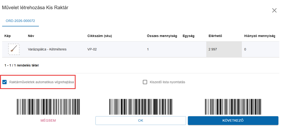 Ha be van jelölve a raktári művelet automatikusan végrehajtásra kerül a rendeléseken