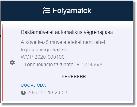 Ha több lokáció van rendelve egy termékhez akkor nem tudja a rendszer meghatározni, melyik raktári lokációra végezze el a műveletet. A műveletben szereplő olyan tételekre, amelyek egyértelműen azonosíthatóak voltak, lefuttatja a műveletet, amelyiket nem tud azonosítani, azokat kihagyja. A kihagyott tételeket később kézzel kell végrehajtani.
