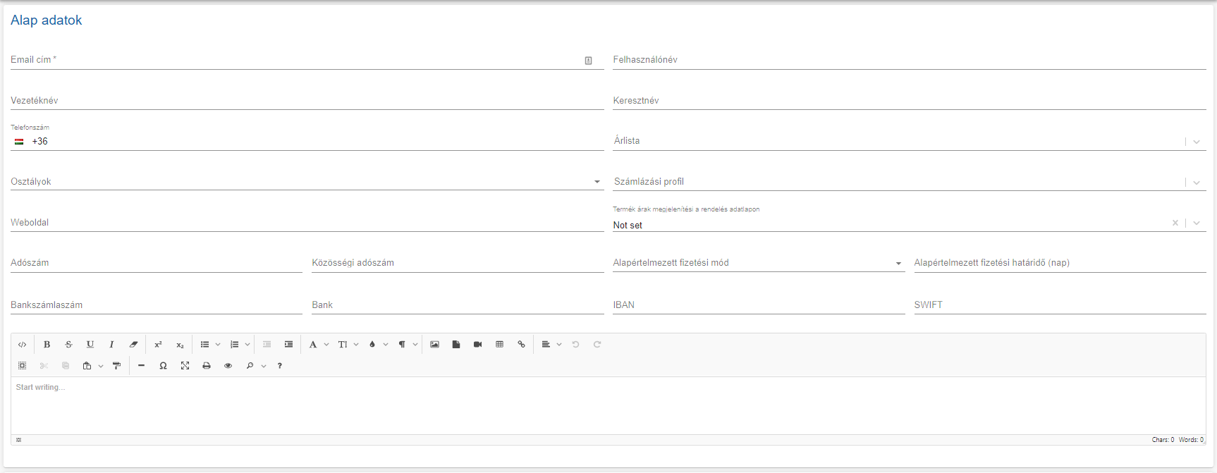 | Email cím | Email cím, az ügyfél egyedi azonosítója. Csak valódi email formátum használható. | A webáruházból érkező rendeléseket az email cím alapján azonosítjuk és automatikus hozzárendeljük az ügyfélhez | |