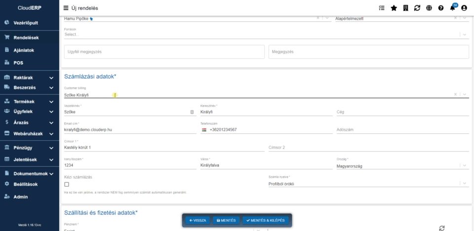 - az alapértelmezett adatokkal tölti fel a rendszer a számlázási adatokat