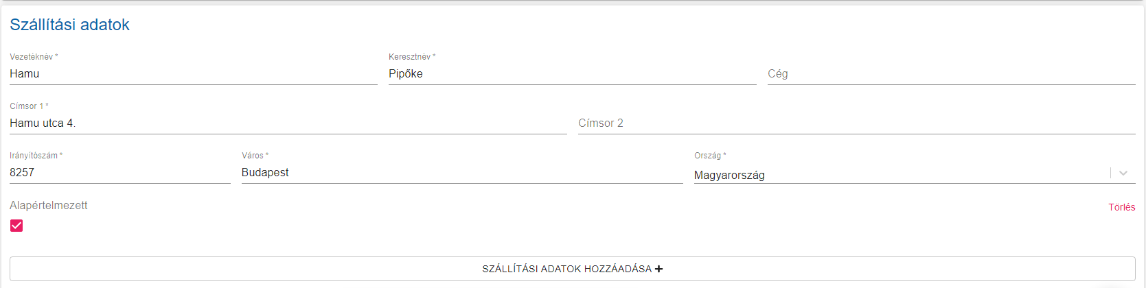 Egy ügyfélhez több szállítási adat is megadható, amiből a rendelés leadáskor választani tudsz. A rendelésen automatikusan az alapértelmezettnek megjelölt szállítási adat lesz kitöltve.